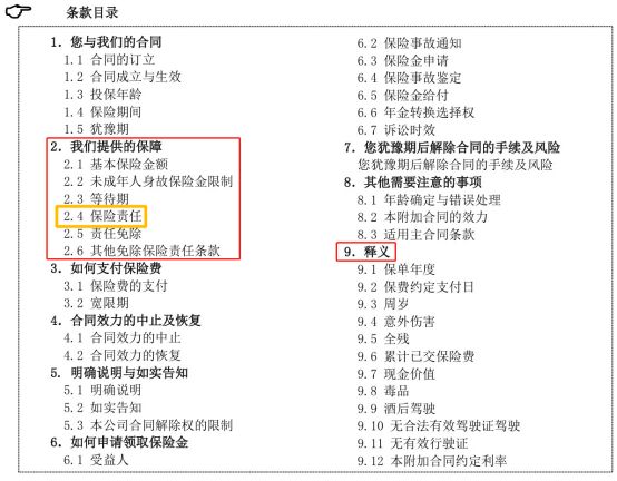 了解合同的保障内容部分,那我们只看条款中“我们提供的保障”就可以了。保险责任:保险公司保障什么,在什么情况下可以进行赔付以及如何赔付。这是一款保险合同的核心内容,务必要看清楚。责任免除:在哪些情况下,保险公司不理赔。这些内容会直接影响出险之后的理赔,务必要看清楚。某些词语的注释:更明确告诉你一些限定条件或赔付条件。比如上面举例中的“初次发生”等关键词汇的解释,一定要翻到后面“释义”去看。保险责任是保险合同中最重要的部分,而保险是我们最有利的保护伞。即使你我只是资本利益中的一环,只是一个生产工具,但最起码我们是一个人,是爸爸/妈妈,是儿子/女儿,是家里不可或缺的一份子。所以,我们只有为自己做好打算,为家人做好打算,配置好完善的保险,把风险都转嫁给保险,那么无论资本凉薄,我们可以有一条后路,可以不惧路途凶险,人心险恶。如此,才能胸有成竹地说出高以翔备忘录中曾经承诺的话:因为你是我一生的爱。
