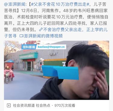 提前把大病风险转移出去,生病就不用为钱苦恼,合理的费用都给报,这个父亲还至于因为10万的治疗费,出走轻生吗?儿子面对镜头的内疚,让多少人揪心啊!