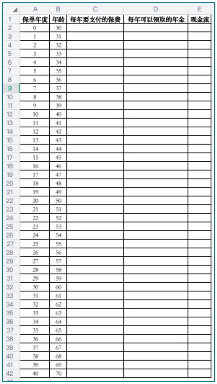 所以,我通常在Excel表里设置这样几列:“保单年度”、“年龄”、“每年要支付的保费”、“每年可以领取的年金”和“现金流”。