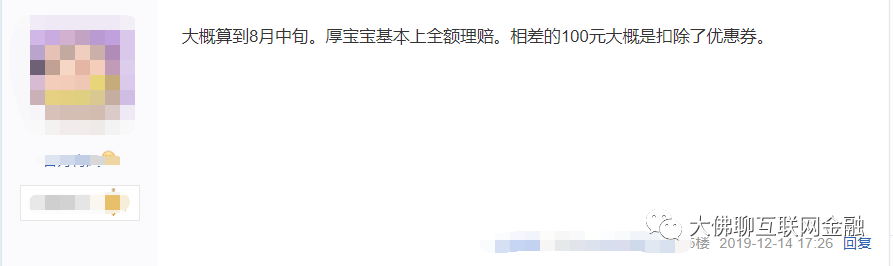 从目前已经收到相关赔付款的反馈中得知,所出借的由保险公司承保的产品标的,具体产品的计息截止时间是2019年8月15日,理赔包括本金和利息两个部分,具体的赔付金额是有一套规则的。所以有部分用户反馈是拿到了连本带息全部的金额,有部分用户反馈是拿到了本金和部分的利息,还有一些反馈是理赔款和自己所投资的金额有一定差异的。