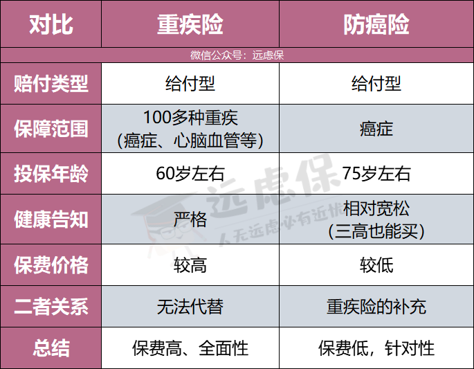 投保年龄广:一般超过60岁以上,重疾险可选择的产品非常有限,而很多防癌险最高75岁也能买; 健康告知宽松:高血压、心脏病、糖尿病等人群也可以投保,而重疾险就很难买了; 价格较便宜:因为只保癌症,价格要比重疾险便宜不少。