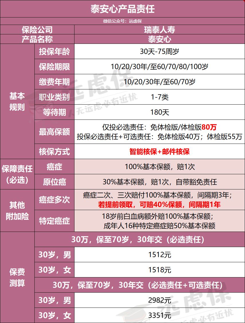 由图可知,泰安心除了基础的“癌症保障+原位癌保障”外,还可附加“恶性肿瘤多次赔、恶性肿瘤保险金提前领取、特定癌症额外赔”等多样保障。