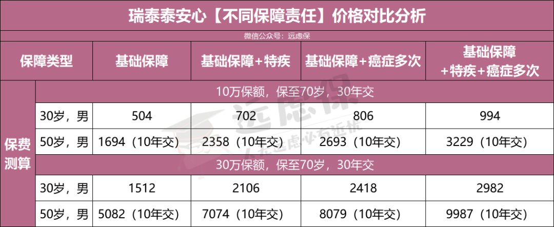 泰安心的保障责任选择灵活,保险期间可选保10/20/30年以及保至60/70/80/100岁;可自行搭配、癌症多次赔、特疾额外赔责任,没有相互捆绑。我们看一下不同选择下的价格如何?