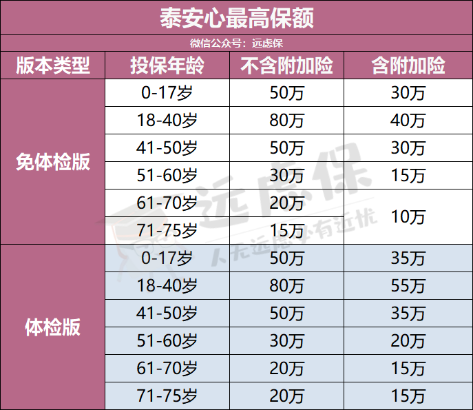 泰安心最高可投80万,18岁以下最高可投50万,40岁以下最高可投80万,即便上了70岁,最高也能买15万。