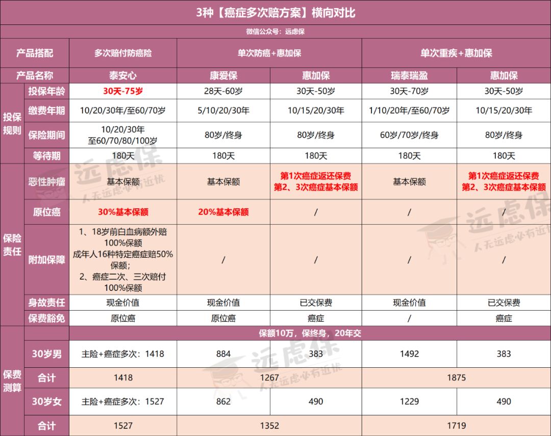 如果想要多次赔付:可以考虑瑞泰泰安心附加癌症3次赔付,也可以将昆仑康爱保和中荷惠加保搭配起来,达到多次赔付效果,保费也不会太高;
