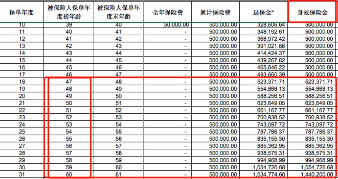 另外,他有一个保底设置:保证领取20年年金,啥意思呢?假设老王领了5年年金就挂了,那剩余15年的年金会作为身故赔偿返还给他。20年的年金是151万6千,这个金额在60岁后是无论如何都能拿到手的。如果还没开始领取就死了,返还保费和现金价值较大者~我们可以看到,在被保险人47岁的时候,现金价值就超过了所交保费,不用担心早死就亏了,最少50万会返给你。总结下,自在人生就是单纯的养老年金险,适合有一笔钱长期不用,作为自己未来的养老规划。