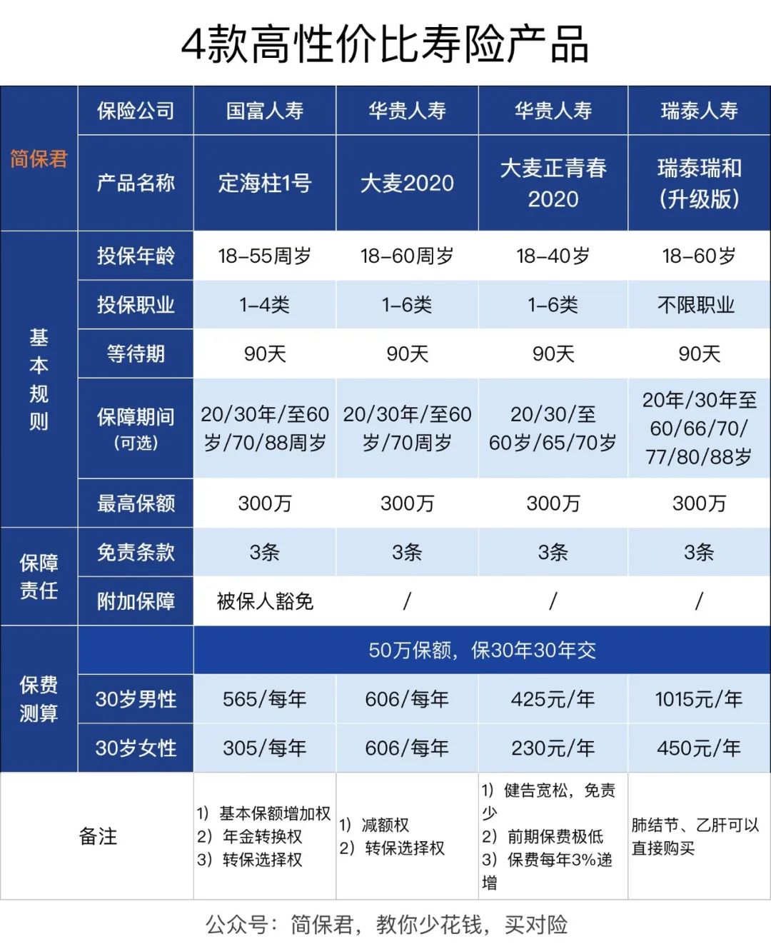 有了基本的配置思路,咱们再来看看我精心挑选的,目前市面上4款高性价比寿险产品。这些产品无一例外都是消费型,也就是说,只保障一定期限内的身故责任,到期之后保障结束,也不返还保费。具体的原因其实刚才已经说了,寿险保障最大的意义,是帮助我们保障特定阶段的风险。消费型的寿险,可以让我们用最便宜的价格,买到最大的额度的保障。我做了一张对比表,你可以很清楚的看到这4款产品的特点和保费高低。优势:价格特别便宜,可申请转换年金/加保/附加被保险人豁免如果身体情况非常好,那么这款产品无疑是非常好的选择,保费非常便宜,相比同类产品便宜15-20%左右,且可选豁免和增额/年金转换权。优势:投保职业广泛,健康告知宽松,可减保/转换终身寿/定寿这是费率仅次于「定海柱1号」的一款产品,同时投保条件更宽松,承保职业也更宽泛,在不限制已有寿险保额的情况下,线上免体检额最高可投300万,还有减保、转换定寿/终身寿的权益,适合追求高保额、加保的不同人群。这是一款保费按照每年3%的费率逐年递增的寿险,在同样的保障情况下,前期的保费非常便宜,投保的前期十几年都是低于同类产品的,所以很适合目前预算有限或者追求前期保障杠杆高的人群。优势:投保条件最宽松,对于常见的健康异常,如结节、乙肝都可以直接投保且女性投保这款产品费率较优,如果身体存在这些异常,那么这款产品是不错的选择。如果看了分析还是不会判断,别着急,往下看, 我列了4个问题,帮你找到最适合自己的。如果身体有些小毛病,或者职业风险较高,选择不会太多,先奔着「瑞和」、「大麦2020」和「大麦正青春2020」去吧。如果你身体健康,恭喜你,可以直接选择国富人寿「定海柱1号」。寿险产品保障责任相对简单,差异不大,产品的差别往往体现在产品的除外责任(免责)上。上次我们才讲过,对于被保险人而言,除外责任肯定越少越好。所以第二步,你需要掂量一下,自己对于除外责任多少的接受程度。这一点因人而异,有的人愿意多花点钱,少一些免责;有的人则对免责内容全盘接受,更愿意选择性价比。当然,我们选择的这4款产品,免责都只有3条,都是很好的。第十二条 责任免除