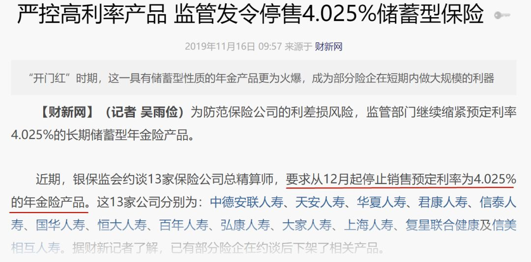 首先,年金险是人身险而不是财险,不单单理财那么简单。这个保障就体现在一定不会让你亏,这个我们放到后面再说。年金险再往大白话方向说,就是一种前期交钱,后期领钱的保险搞细一点就是什么时候我才能领啊、多长时间可以领一次啊、每次能够领多少钱啊。每款产品设计不同,就会有细节处的不同,但白猫黑猫都是猫,本质是不变的。保险比银行更安全,这句话也许你听来没感觉,无所谓。说一个你能感同身受的,就是保险是国计民生且有国家兜底,再说个更直观的:年金险是白纸黑字写在合同上的,你我都知道合同的重要性吧?再给大家强调一遍:依法治国,年金险有合同、合同、还他娘的是有合同。好,记住了第一大特点,这跟其它妖艳贱货不大一样,除了安全就是安全。它的第二大特点,也可以说是堪称独一份的作用,那就是可以贯穿几十年锁定一个利率。就是无论经济摆烂、还是什么熊市烂市、该什么时候领就什么时候领,该每年多少利率还是多少利率,雷打不动。合同签订之日起,一切都决定好了,到时间领钱,让养老更有尊严,让教育更有质量。这两大特点,一个安全零风险,一个锁定利率,也是区别于其它理财方式。再说一说怎么看收益,收益其实跟你复利时间长短有关。比如30岁买,60岁开始领取,一直领取到死,实际复利了30年,越活得长收益越高。总之,收益其实产品不同、缴费期限不同,领取时间不同,收益就不一样。你也许只能说半懂,没关系,后面还会用具体产品具体分析,就能全搞懂。很多人,包括一些理财达人,自媒体大V都把预定利率当收益率,真的,很蠢。就是衡量产品价格的利率,大白话就是保险公司拿着我们的保费去投资,预估投资能够获得的利率收益。那么,原来是4.025%,那么现在银保监会明文要降低,且明令各款年金险分批次下架。也就是说以后的年金险预定利率只能最高到3.5%,意味着保险公司的预估收益会下降。错,大错特错,保险公司预估收益降低,要想达到同等收益,那么保费自然就会上涨。再换句话说,就是本来咱们普通消费者,在预定利率没下降前买年金险每年能领7万,一直领到死;下降后同等资金投入年金险,每年只能领5.5万,一直领到死。这中间的差距往小了说是十几万,往大了说就是几十万的差距。所以,从去年年底,年金险只有一个字可以形容,那就是火、两个字爆火、三个字就是超级火!!!火的因素还有一个就是稀缺,本来预定利率4.025%设计的年金险就少之又少,关键是银保监会严令一个个停售掉。大家有熟悉的就知道从去年11月底开始,五星级的年金险,如意享、相伴一生、自在人生等十几款停售。甚至监管直接约谈13家总精算师,要求从去年12月起停止销售预定利率为4.025%的年金险产品。你听这个单位名称还不能感觉一二吗?银保监会全称中国银行保险监督管理委员会,国务院直属的正部级单位。那么你觉得经济形势如何走向,更是没有人比银保监会更清楚了吧?也就是从11月底开始,余额宝收益一降再降,现在到了可怜的1.5%。国债利率也一再降低,去年9月末,10年期国债收益率为3.14%,但是相比6月末已经下降了9个基点。哪怕是最近要发放的1000亿元特别国债,7年期国债收益约为2.85%,远低于去年9月7年期国债的3.17%,更远低于去年6月的3.26%就连前央行行长都在说负利率会慢慢到来,所以高利率的年金险下架你觉得还奇怪吗?再给大家说个年金险的趣事,你就能明白为什么年金险进入抢购潮。1996年5月,银行存款利率是9.18%,保险预定利率是10.00%,但是短短两年,1998年存款利率急剧下降到3.78%,年金险预定利率急剧下降到4.5%。到今天为止,当初90年代买过哪个时期年金险的朋友,还会大吹特吹,还会觉得无比幸运。10%啊,朋友们,现在想来是不是天上掉馅饼的感觉?这就跟现在一样,4.025%预定利率年金险会下降到3.5%,之后还会一降再降,这是历史必然,这是经济必然。那么一二十年后的你,是不是也一样遗憾当初没买4.025%年金险?话糙理不糙,所以年金险一火再火,这些人不是傻子,反倒精明到极致。年金险存量越来越不足,为避免营销性,我挑个6.18日刚停售的年金险给大家分析一下。 已停售的富德生命大富翁年金险,14-60周岁都可以买。