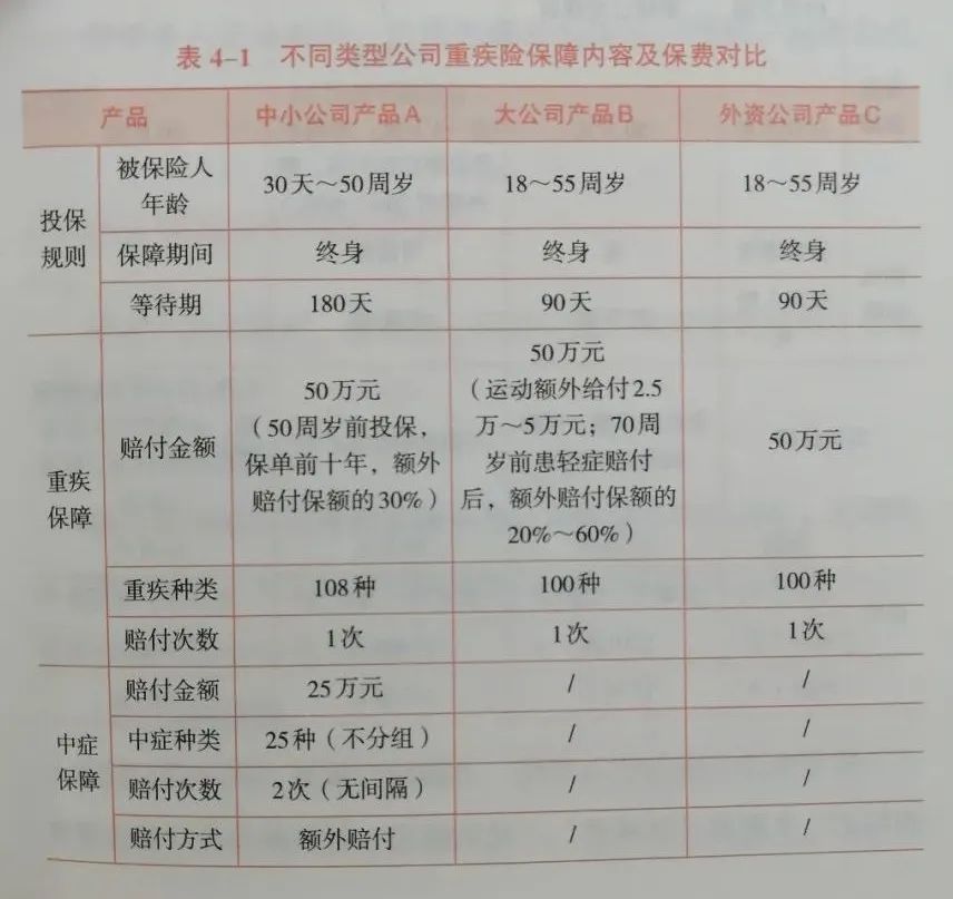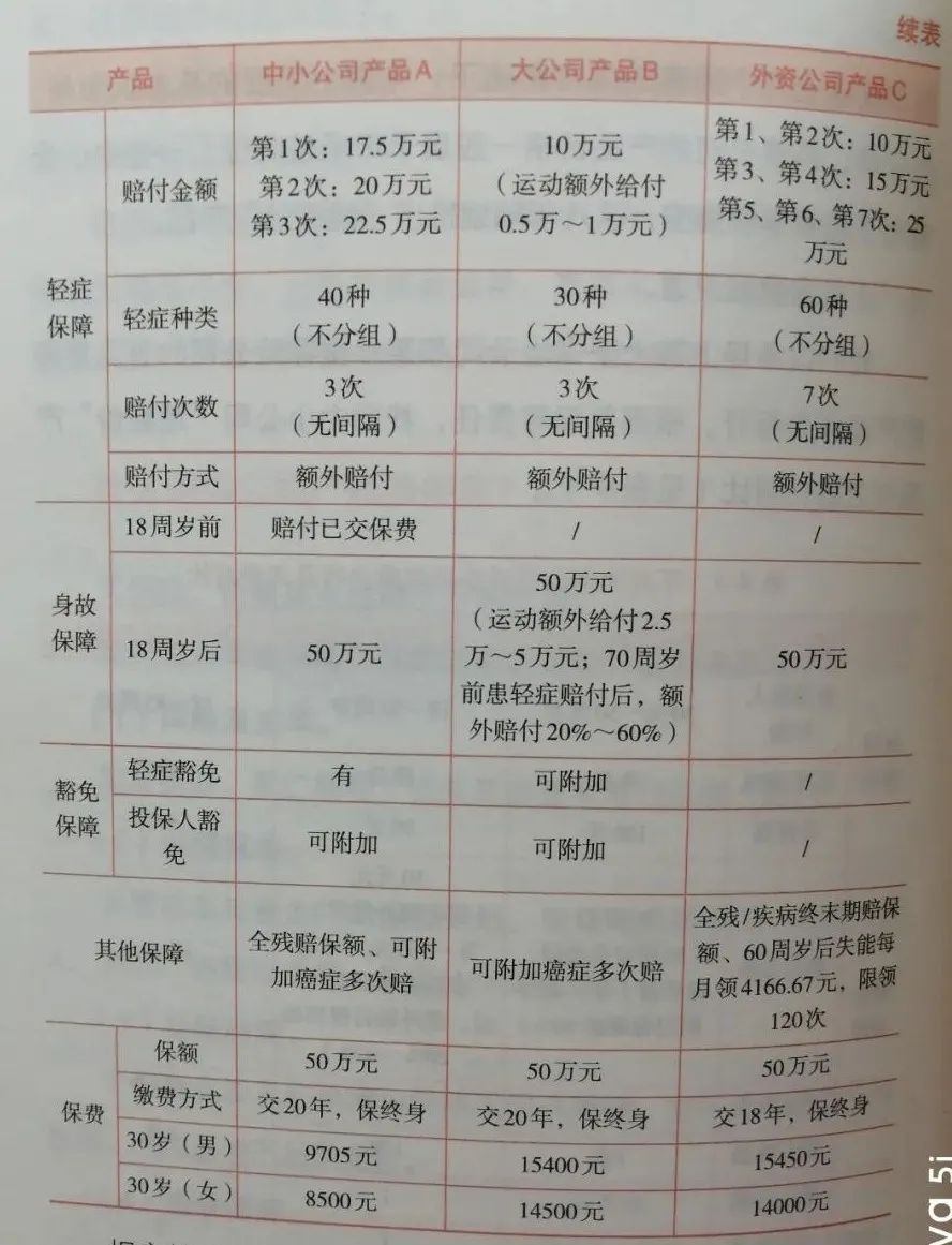 说到选保险公司,我想很多人首先犹豫不决的,就是到底该选知名度高的大公司还是一般的中小公司呢?回答这个问题,就得首先了解清楚大公司和中小公司各自的优势和劣势。一般而言,大公司的组织管理相对更高效,经验更丰富,服务能力也更强,这是他们的优势,他们的劣势就在于产品的价格定价比较高。而中小公司正好与他们相反,优势就是产品价格比较低,但服务机构相对更少,服务能力相对较弱。《保险怎么买?》这本书的作者高高老师,用一款主流的重大疾病险产品作为标杆,比较了一个中小公司、一个国内大公司、一个外资公司的报价和条款差异。从表格中我们可以看到,这份重大疾病险产品,三个公司的保障内容其实差不多,但是中小公司的报价却比国内的大公司和外资公司的报价便宜了将近1/3。中小公司30岁男性的报价只有9705元,而国内大公司和外资公司的报价分别是15400元和15450元。30岁女性,中小公司的报价只有8500元,而国内大公司和外资公司的报价分别是14500元和14000元。如果单纯只从价格考虑,高高老师的建议就是,如果家里的经济条件不是特别好,保费预算有限,在购买重大疾病险、定期寿险产品的时候,可以选择中小公司的产品。因为这两类保险花费比较高,如果选择中小公司的产品,可以节省一笔不小的钱。而且这两类保险理赔的概率低理赔的频次少,所以即使保险公司的机构少,服务能力弱一点,影响也不大。而购买医疗险、意外险的产品则可以选择大公司和外资公司,因为这两类保险价格本来就不高,各个保险公司之间价格差别都不大,但是医疗险和意外险理赔的概率却比较高,理赔的频次也比较多,所以保险公司的服务能力就很重要。因此,选择服务更好的大公司和外资公司,后续赔付的时候,体验就会更好一些。有的宝妈可能会说,那选了中小公司,万一出险,中小公司不赔付怎么办?