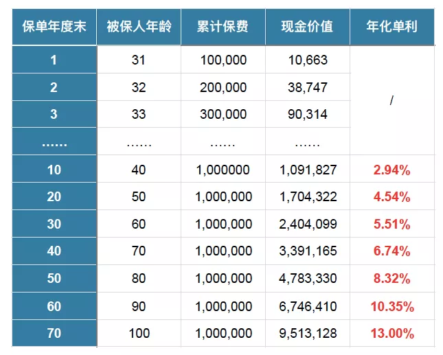 小明30岁,年交10万,交10年,现金价值和单利如下。产品实际200元起投。