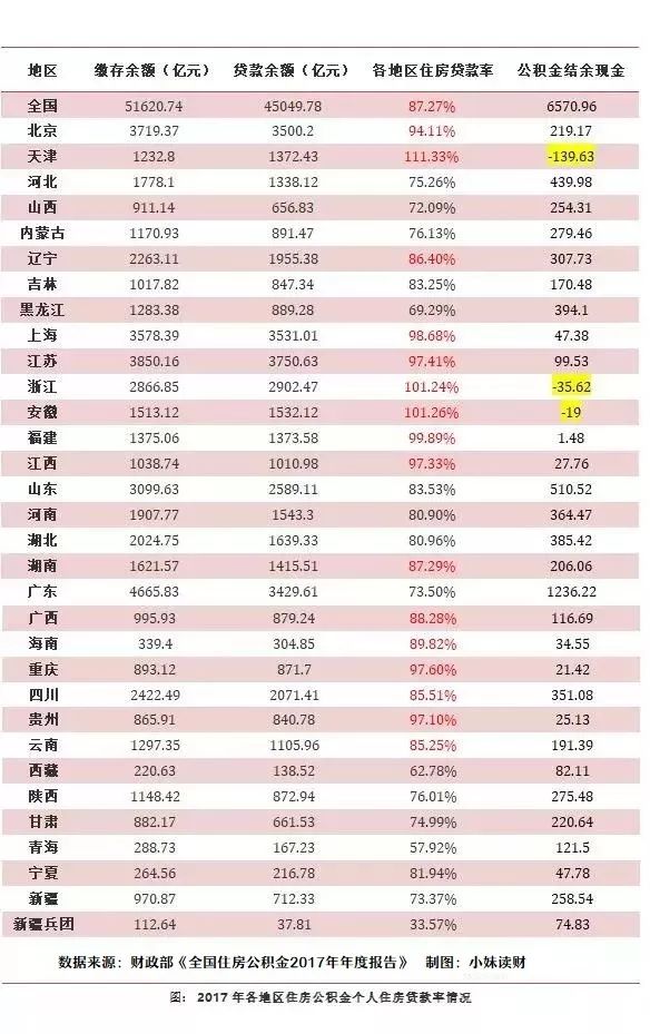 从上图可以看出,有16个地区(标红的数据)的个人住房贷款率超过85%预警线,而且天津、安徽、浙江超过100%(标黄的数据),这意味着这3个地方的公积金余额已经不够放贷款了。
