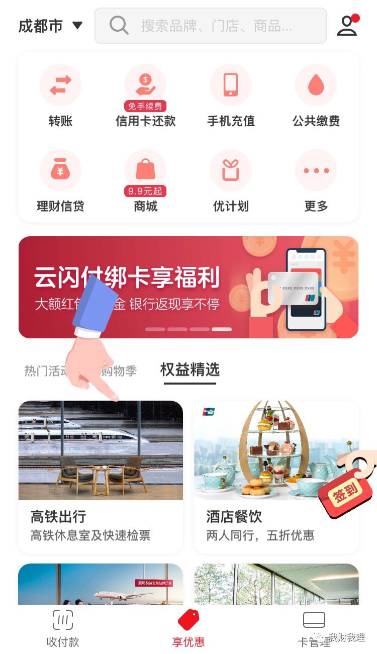 微信公众号——中国银联95516——惠——高端卡礼遇(图一手指处)或者云闪付APP——权益精选——高铁出行(图二手指处)