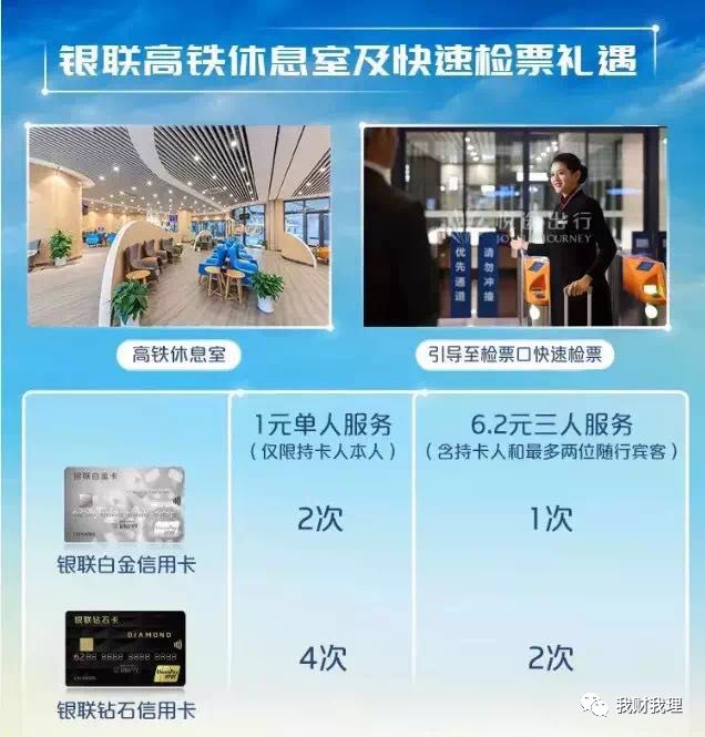 62开头的银联钻石信用卡持卡人,可在上海、广州、深圳、杭州等全国近20家高铁站以优惠价享受高铁休息室及快速检票服务,即4次1元单人服务(仅限持卡人本人)、2次6.2元三人服务(含持卡人和最多两位随行宾客)。