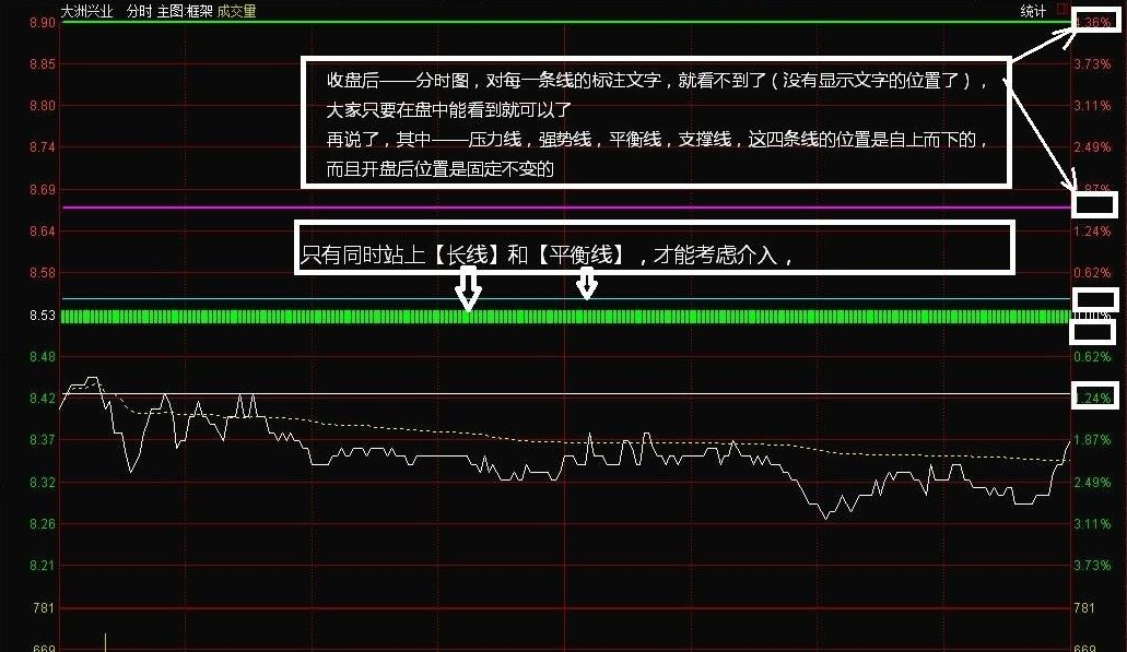 2、四条指标线,一开盘就固定显示,理论上不再变化(使用的日线收盘价,无未来数据),而且四条线的上下顺序是固定的(【压力线】,【强势线】,【平衡线】,【支撑线】,【长线:红多绿空】)。