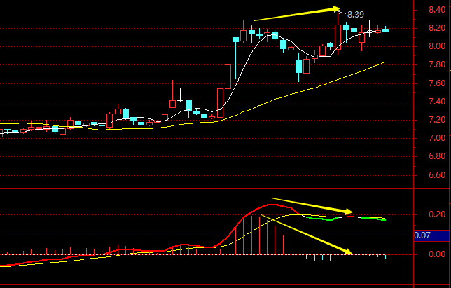 第二题:华明装备30分钟出顶背离,而且是DIFF顶背离和红柱顶背离两种同时出现,这种情况必须减仓选A;认为完全没必要减仓选B;有风险随时关注,准备随时减仓选C。