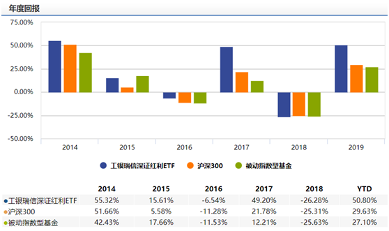 从历史表现来看,这只基金堪称“优秀本秀”。短期来看,这只基金今年的收益率为50.80%,跑赢跟踪指数。长期来看,自该基金2011年成立以来,总回报93.12%,同期沪深300上涨12.13%,上证综指更是下跌5.26%。此外,从2014到2018的自然年份里工银瑞信深证红利ETF也表现出明显的“能涨抗跌”的优势。