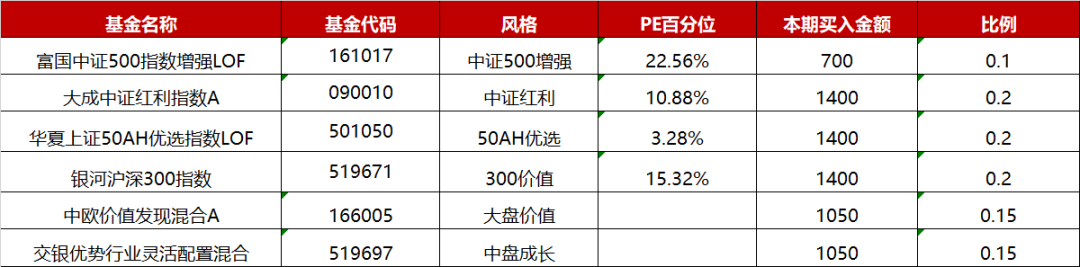 平均PE百分位跌到13.01%了,基础定投金额上升40%,由5000元变成按7000元定投。具体比例如下。