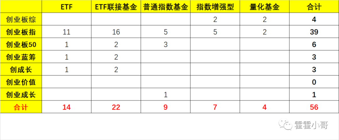 梳理完所有的相关指数外,指数的分类统计也就呼之欲出了,一共有56个指数基金(不同份额类别视作不同数量),跟踪最多的指数是创业板指。所以接下来的部分除了对创业板指的相关基金会区分介绍外,其他指数的相关基金就直接合并梳理。一共有11只ETF,成立最早的是博时创业板ETF,但是规模最大的是成立时间稍晚于博时的易方达创业板ETF。比较有意思的是基金简称,因为是ETF,所以场内的基金简称对字数会有一定的限制,名字最好的无疑是创业板(易方达创业板ETF),博时创业(博时创业板ETF)和创业ETF(广发创业板ETF)的名字次之,接下来是创业板HX、创业板PA、创业板FG、创业板TH,采用的是基金公司名称的前两个字的首字母进行区分,也不失为一个好办法,剩下的名字则是比较奇葩。以至于过去多次被别人问起过是不是显示错了漏了某些字,创业板EF、创业板E、创业板ET、创业板F,就是在ETF字母之间进行C1和C2的组合,基本没啥区分度,不知道后面会不会出现创业板E和创业板TF。
