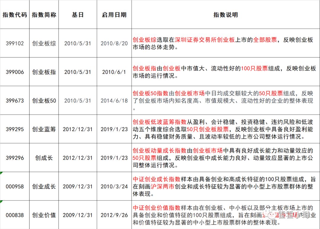 按照老套路,还是从业绩比较基准出发,但是之前在中证500系列也提到过,业绩比较基准的表述非常的不规范,如果直接从业绩比较基准出发工作量是十分巨大的,所以一般还是会辅助基金的名称进行全部基金池的统计。毋庸置疑,要筛选创业板的指数基金,名字中带有“创业”二字的都是备选。会发现,同样是“创业”字样的基金,实际上跟踪的指数未必一样,比如“广发创业板ETF联接C”跟踪的是创业板指数,海富通创业板增强A跟踪的是创业板综合指数,除此之外还有一些跟踪的是创业板相关的小众指数。其实沪深300和中证500也会有类似的情况,比如300价值,500低波等等,但因为跟踪300和500的指数基金的数量已经比较大,而且区分度比较高,并没有混在一起,留在后续专题分析。但创业板中总体的基金数量有限,而且像创业板指和创业板综指比较容易混淆,所以这篇文章打算把相关的指数都包含在内。尽可能穷尽统计后(不排除有遗漏的,欢迎大家补充),目前跟创业板相关的指数有以上7种。创业板综(399102)的样本是包括了在创业板上市的全部股票,反映的是创业板市场的总体走势;创业板指(399006)是创业板中市值大、流动性好的前100只股票,创业板50(399673)是创业板中日均成交额较大的50只股票。创业蓝筹(399295)和创成长(399296)的样本数量都是50只,不同的是一个注重的是盈利能力,一个注重的是成长能力和动量效应;剩下的两个指数创业成长(000958)和创业价值(000838),虽然带了创业字样,实际上并不是纯粹的创业板相关指数,样本中包括了沪深两市的股票,前置兼具创业和高成长特征,后者兼具创业和价值特征。