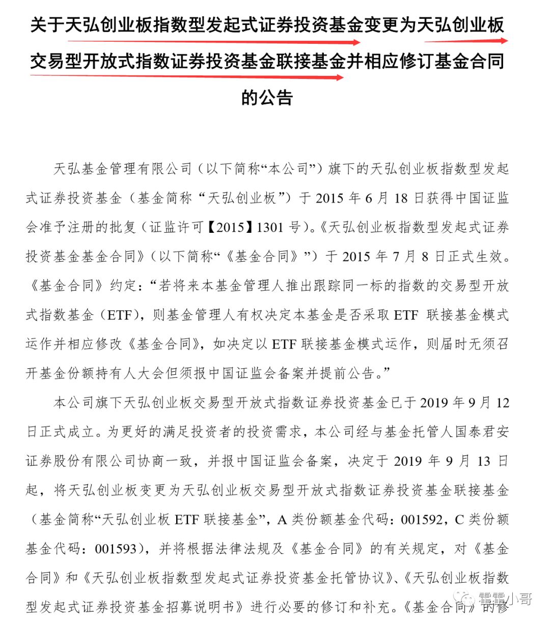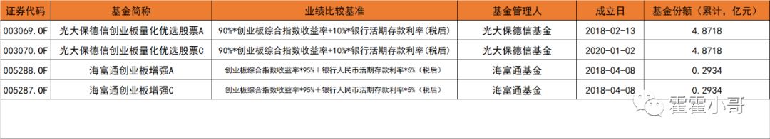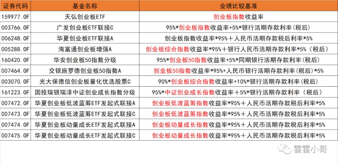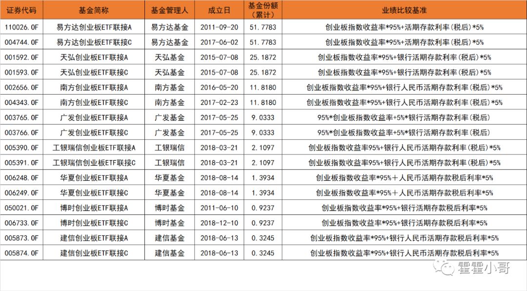 一共有8只(16个份额类别)的ETF联接基金,11个ETF中嘉实、平安和富国暂时没有ETF联接基金,其他都设置了AC类别。其中比较特殊的天弘创业板ETF联接基金,会发现ETF是在2019年9月12日成立的,但是联接基金居然早在2015年7月8日成立,这是因为这只基金经历过基金合同和名称的变更,原来是一只普通的指数基金,随着ETF的成立后,将普通的指数基金转型为ETF联接基金。其他类型的基金中,前五只是普通的指数基金,然后是指数增强型基金,最后两只是量化基金。以“创业板综指”作为业绩比较基准的只有2只4类,这也是非常好理解。指数基金的本质是跟踪指数,但因为创业板中数量较多,有些股票规模较小、流动性较差,如果基金的规模比较大,会产生比较多的问题。这2只基金都不是普通的指数基金,一个是指数增强型,一个是量化型。