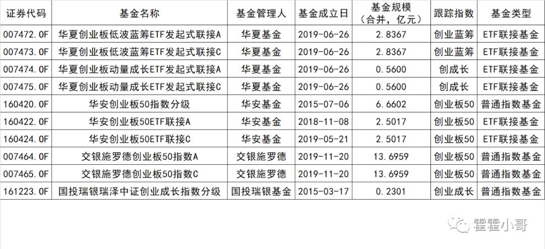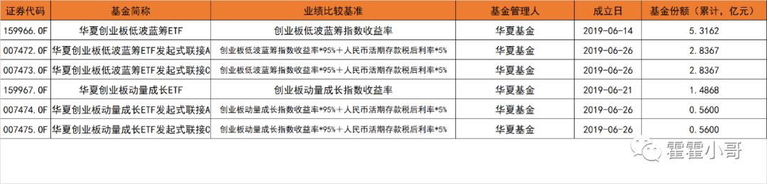 可以发现“创业板50”基本是华安基金的天下,不光有ETF,还有ETF联接和分级基金,合并规模有63亿左右,除此就是交银施罗德的普通指数基金。创蓝筹和创成长,则是华夏基金的天下,这两个指数也是在2019年1月23日刚刚启用,近半年的多次数据可以发现其表现是要好于创业板的,但规模还有待发展,现在大家更熟悉的还是创业板50,创蓝筹和创成长还需要继续发力。