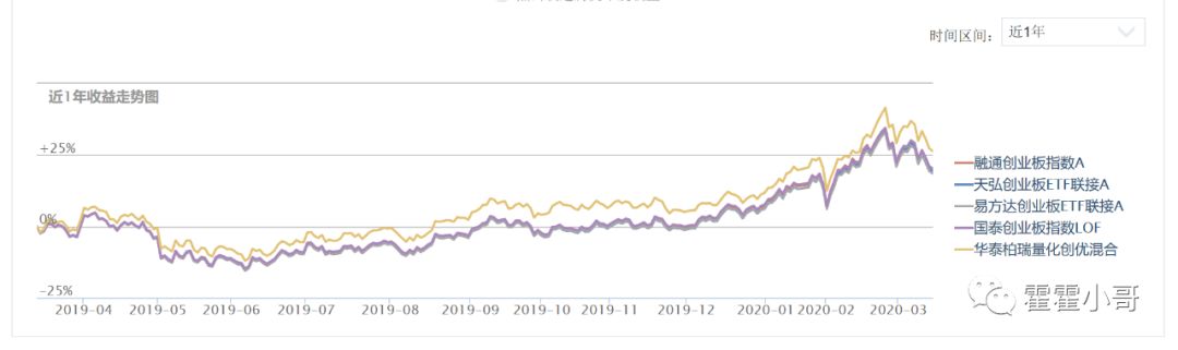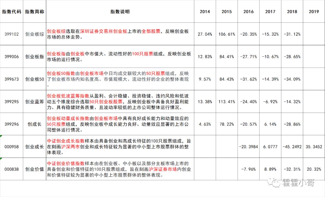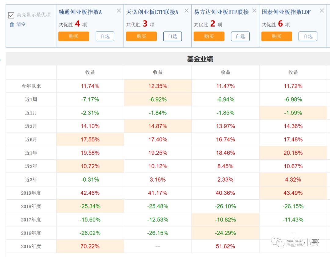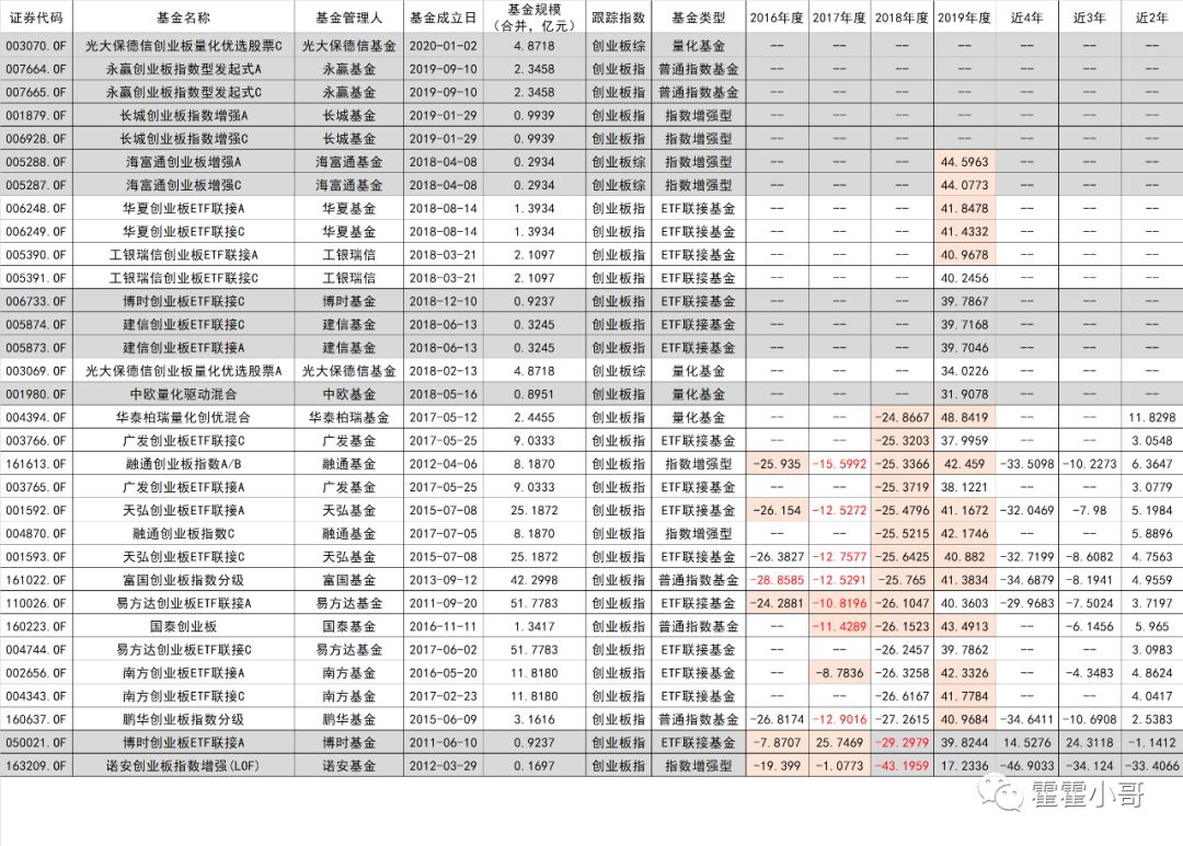 剩下并没有那么纯的指数就是创业成长和创业价值,目前没有基金跟踪创业价值,创业成长也只有国投瑞银的一只基金在跟踪,2019年底的规模仅为2300万,不知道是否会沦为迷你基清退的下场。至此,创业板相关的基金已经全部梳理,这也是为什么没有只涉及创业板指或者创业板综指的原因,是因为总体的数量确实还是比较有限。可以先看下7个指数的业绩表现,数据来自于指数官网,因为中证指数和深证指数官网提供的数据维度略有不同,会发现部分数据的缺失,也就没有通过其他方式补全,有小伙伴有的话也欢迎提供下。将跟踪创业板指、创业板综指的基金放在一起比较,除去ETF基金,一共有32只,低于1亿规模的有10只,在19年之后成立的有5只,一共有13只,置为灰色,红色字体的是没有超过创业板指的业绩,打底的颜色是阶段性表现靠前的基金,表格最后的排序是以2018年度的业绩表现排名。成立3年及以上的基金中,融通创业板指数A/B和天弘创业板ETF联接A、易方达创业板ETF联接A、国泰创业板的综合表现还是比较优秀的,华泰柏瑞量化创优混合则是成立不足3年中表现不错的。分别看下四只基金和五只基金的对比,结论还是比较明显的。剩下的其他指数的跟踪基金中,除了华安创业板50指数和国投瑞银瑞泽中证创业成长指数分级的成立年限较早,其他都成立未满一年无历史业绩可分析。