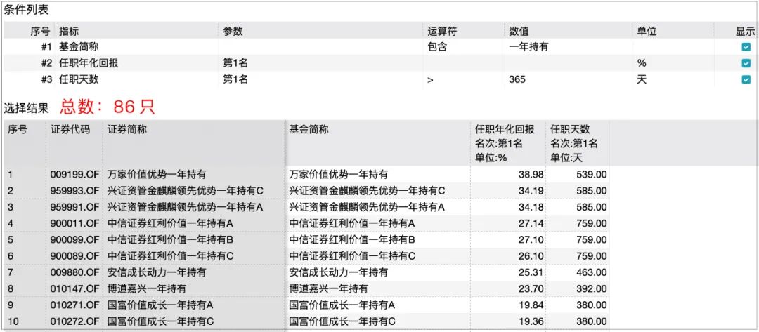 先说下Wind筛选方法和指标:1)从股票型和混合型基金中,挑选出名字中包含“一年持有”的产品;2)按照基金经理任职以来,年化收益率的高低进行排序;3)现任基金经理管理该产品时间超过一年。