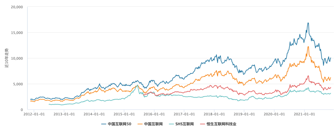 从过去10年的表现看,中国互联网50指数波动最大,其次是中国互联网指数。