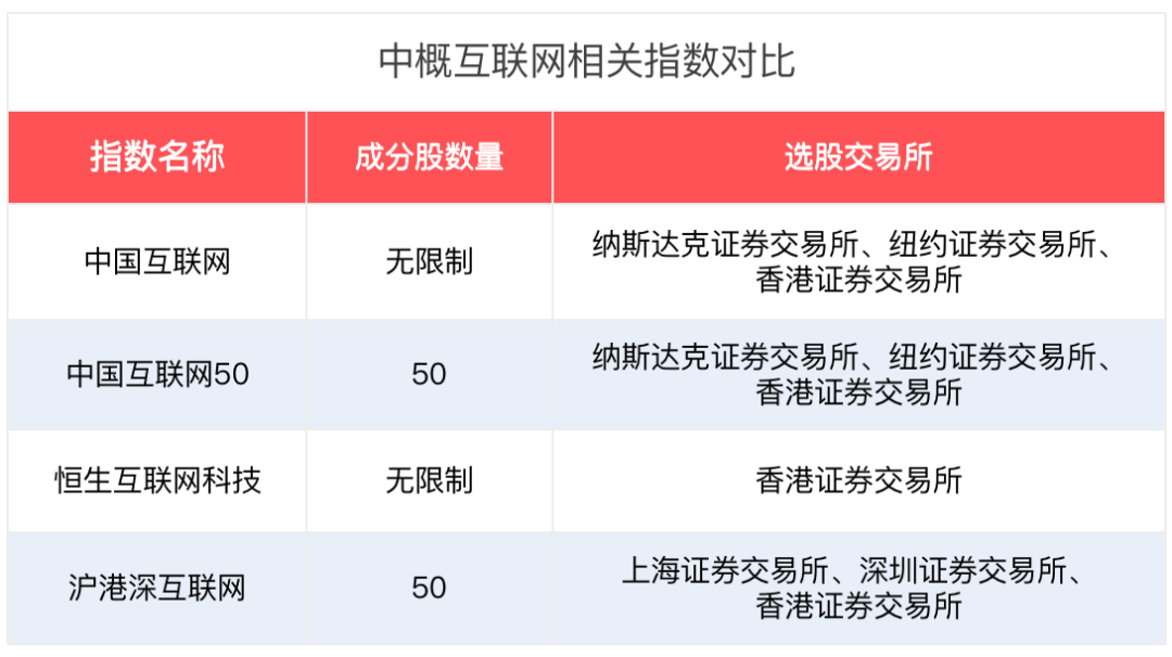 中国互联网指数和中国互联网50指数,都是选取海外交易所上市的中国互联网企业作为样本,区别在于后面的数字以及编制股票的权重不同。