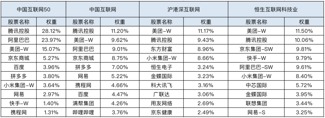 沪港深互联网指数和恒生互联网科技指数,因为选股范围的区别,前十大重仓股还加入了金蝶国际、中芯国际等企业。