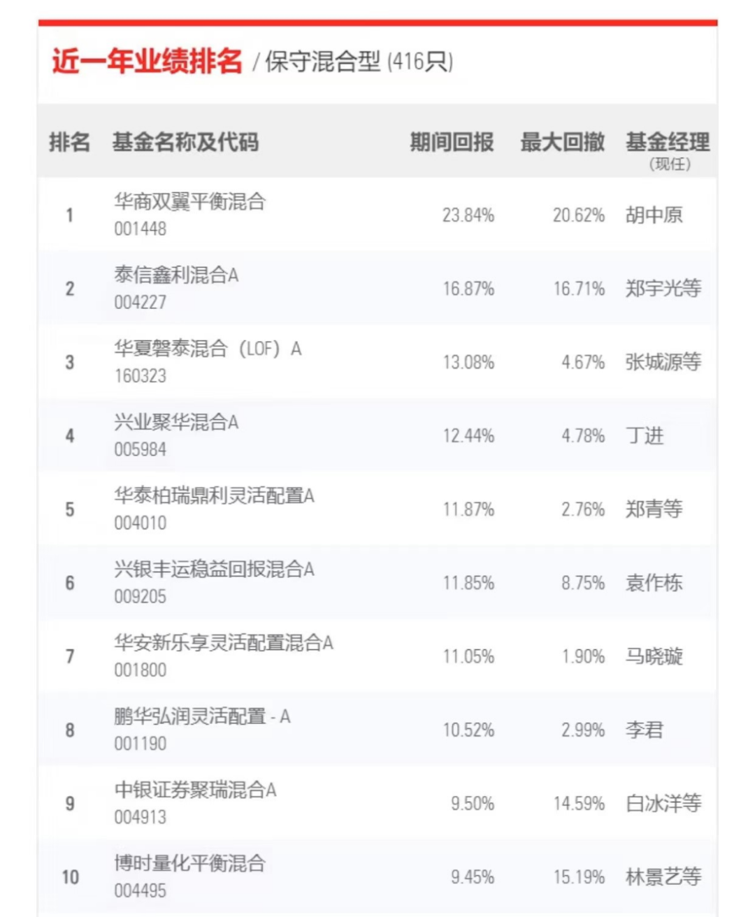 可以看到,榜单是按收益率进行排序的,前5的产品包括了华商双翼平衡、泰信鑫利混合、华夏磐泰混合、兴业聚华混合及华泰柏瑞鼎利灵活配置,收益率表现都在10%以上。在近一年的先震荡再下跌的市场中,能取得这样的收益率水平,对于比较保守的产品来说,应该说都是相当优秀的表现。