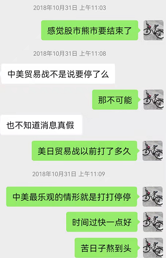 2018年10月31日,我和他说熊市快要结束了。他就问中美贸易战是不是要停了?因为贸易战不停,股市怎么可能涨?