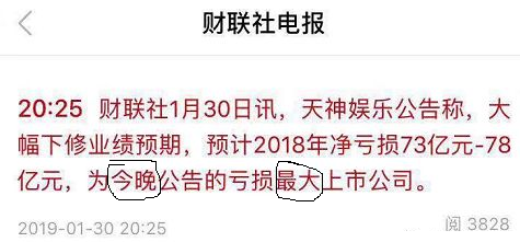 “最大”,说明一整个晚上,大家都在看亏损预告比赛,哪家公司亏最多亏最惨,结果天神娱乐登顶。
