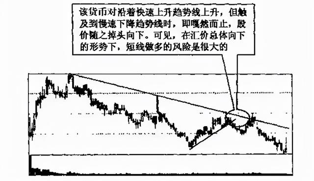 投资者在汇价(指数)处于慢速下降趋势线的下方时,应坚持看空,并以做空为主