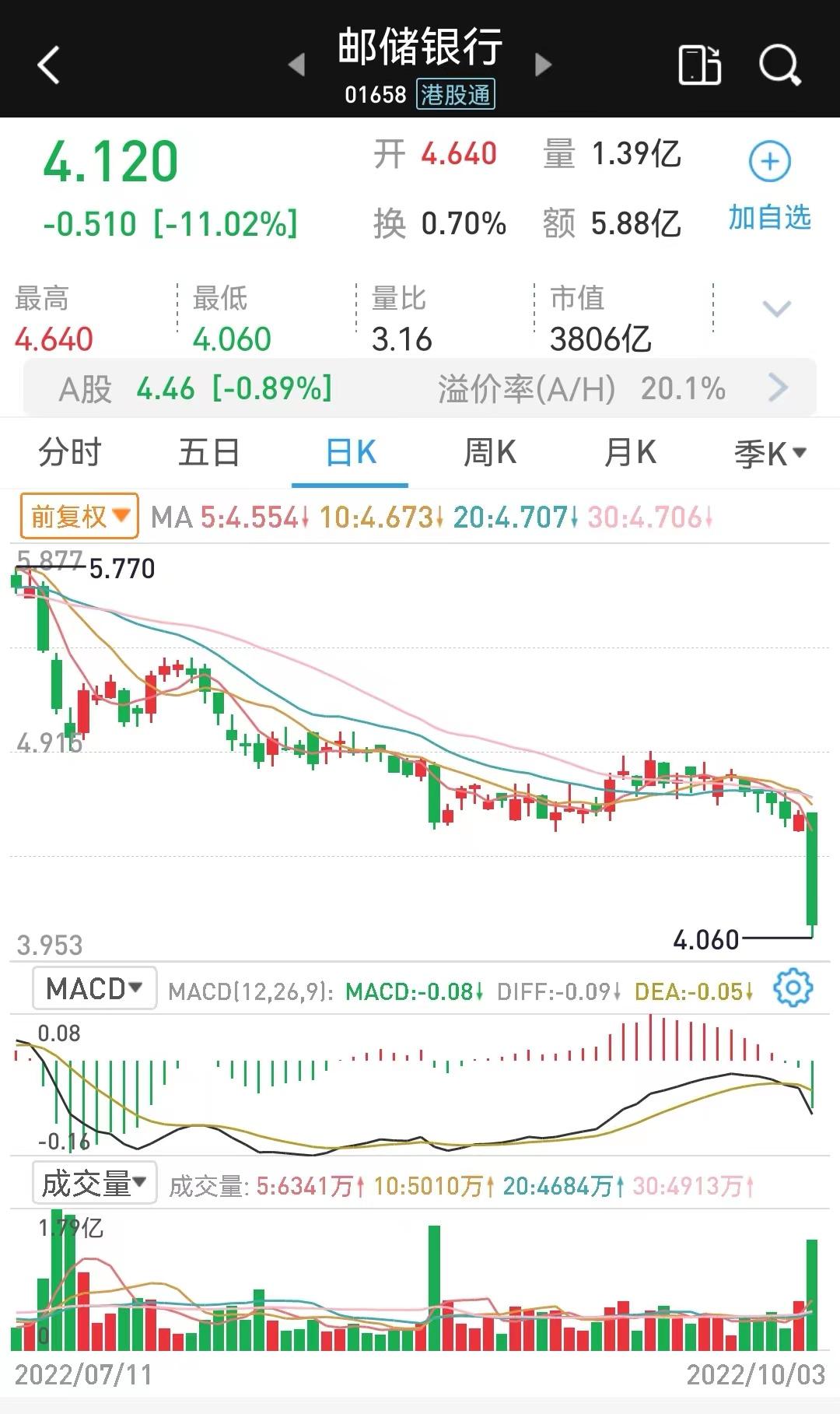 在国庆过后的首个港交所交易日,因为受之前披露的李嘉诚基金会减持邮储银行的消息影响,邮储银行的H股大跌11%,收报4.12港元,在香港上市的部分大型银行的H股市盈率已经跌破了三倍。但是相对A股来说,银行板块的H股市盈率更加有吸引力。在同股同权下,基本上港股的投资价值更高一些。