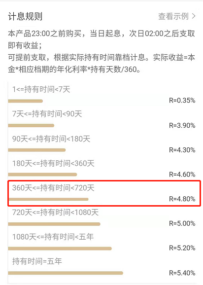 我们重点关注的是满一年以后的利率,从下图可以看到,持有满一年的话,利率为4.8%,这个利率完爆货基,甚至相比于低风险理财产品来说也是顶尖的。