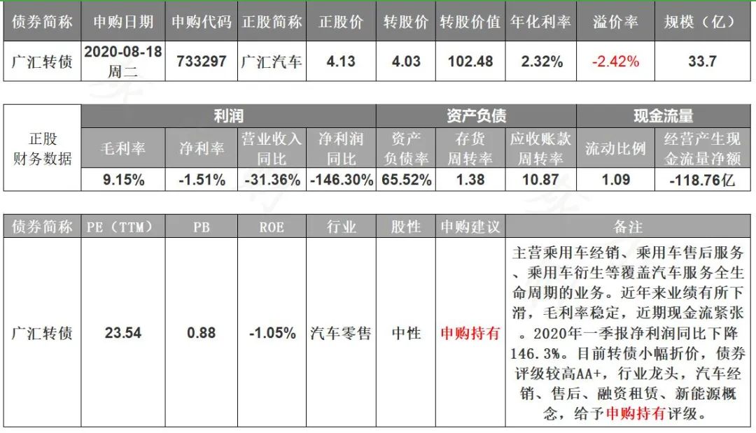 广汇汽车可转债8月18日(周二)打新申购,沪市转债,若持有正股,可进行配售。