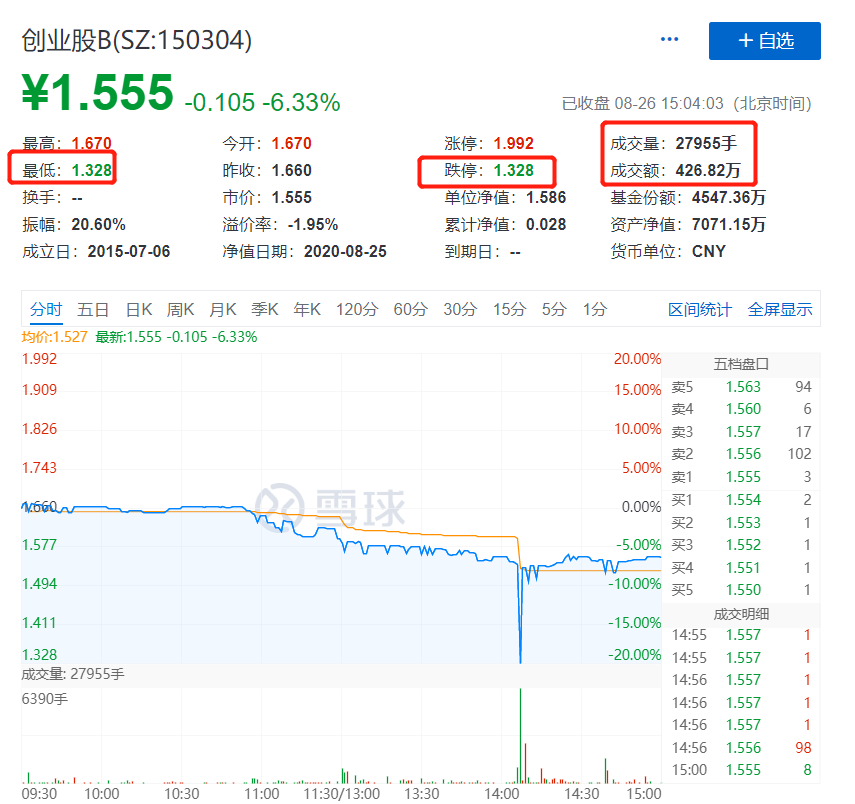 不知道盘中谁捡了便宜,反正收盘的时候,这个分级B的场内交易价格,又从跌停的1.328拉升到1.555了,等于跌停“捡漏”买到的人今天一天就赚百分之一二十。