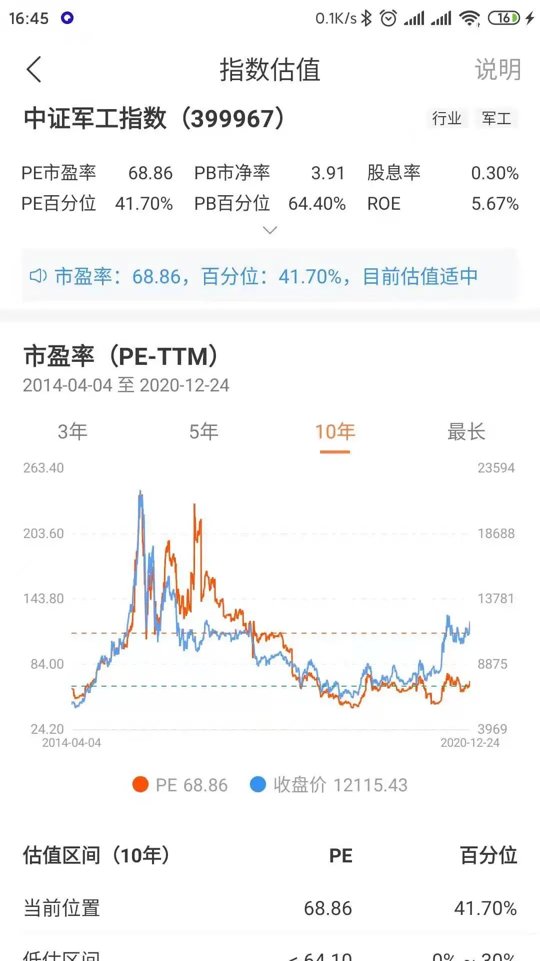 最近军工板块走势比较强,似乎又要重演七八月份的大涨行情,我看到雪球社区里也出现了不少关于军工主题的帖子,不少投资者也是跃跃欲试。为了防止大家盲目投资,我梳理了市场上关于军工的投资逻辑,今天简单的给大家分享一下。从业绩表现来看,国防军工行业以49.55%的涨幅排在第五,排在它前面的要么是上半年的主线生物医药,要么是下半年的主线电气设备。但是国防军工的走势并没有那么一帆风顺,军工的行情是从7月大涨行情开始的,涨到8月中旬便开始了三个多月的回调,直到最近一个月才有所回暖。下面是我从多家研报中收集的观点,大家可以参考并理性投资。相比于其他行业,国防军工由于其自身特殊性,透明度低、可追踪指标少、透明度低,研究难度大,不太被市场上主流的价值投资理念认可。因此,过去的国防军工行情多偏向于主题炒作,比如事件性因素催化或者市场情绪高涨、风险偏好较高时会来一波,比较典型的就是历次牛市中,军工板块从未缺席。但是从2019年开始,军改落地企业订单恢复与部分军工股估值回归合理,军工板块景气度上行,基本面逐渐改善。从前三季度申万一级行业归母净利润增速来看,国防军工行业净利润同比大幅增长25.29%,在28申万一级行业中排名前列。招商证券认为支撑行业利润增速高速增长有两大原因:一方面是因为利润率较高的军品业务仍保持较高的增长;另一方面随着军品收入的快速增长,规模效应开始显现,盈利能力持续提升。市场的国防军工行业的投资逻辑可能由之前的偏主题炒作切换到现在更加看重基本面的改善。国盛证券认为,我国国防军工行业将进入“短期/3年爆发、中期/7年升级、长期军转民持续发展”的高景气时代。“十三五”之前一直是我国重点型号装备的研制、定型或者小批量列装阶段,到“十四五”已经进入到需要通过大批量的装备列装正式形成我国军工作战能力体系的时期,这是产业发展的必然趋势。因此,国盛证券认为,11-12月军工行业“十四五”武器装备订单将陆续释放,这是行业景气度得到验证的重要催化剂。《中共中央关于制定国民经济和社会发展第十四五年规划和二0三五年远景目标的建议》中首次提出2027年建军百年奋斗目标,而这个目标的实现离不开国防军工行业的大力支撑,国防军费占GDP比重有望提升。根据银河证券研究,2020年国防军费预算约为12683.07亿元,同比增长6.6%,过去十年符合增速约为9.37%。从绝对额来看,我国军费规模已位居世界第二位,但GDP占比仅为1.3%左右,远低于美国3.5%和俄罗斯的3.3%。国盛证券认为,国防军工技术是很多先进技术的源泉,发展军工不仅是提高国家科技创新能力的重要方式,军转民更是将高端军工技术与工程师红利释放的重要途径。军工技术的突破牵引的是上千亿、万亿的民用产业,例如,大飞机、航空发动机卫星互联网、芯片等行业,给军工企业带来巨大的成长空间。另外,借鉴美国的产业发展趋势,在美股1973-2019年各行业中航天与国防以年化11%的收益率领先。随着我国的崛起,以及面临着诸多的挑战,国防军工行业有望走出类似的趋势。最后机构投资者也开始认可国防军工的成长逻辑,公募基金对军工行业持仓占比从二季度开始探底回升。根据三季报披露情况来看,公募基金军工持仓占比为1.9%,同比增长0.7%,环比增长0.9%。从公募基金持仓占比和中证军工走势来看,公募基金对军工行业还是比较有定价权的。目前,公募基金对军工行业还是处于低配装状态,远低于2015年高峰期,随着军工行业景气度持续上行,公募基金对军工行业的配置有望持续提升。目前,从估值水平来看,中证军工指数滚动市盈率为68.86,处于历史均值以下,PE百分位为41.70%,属于合理区间。