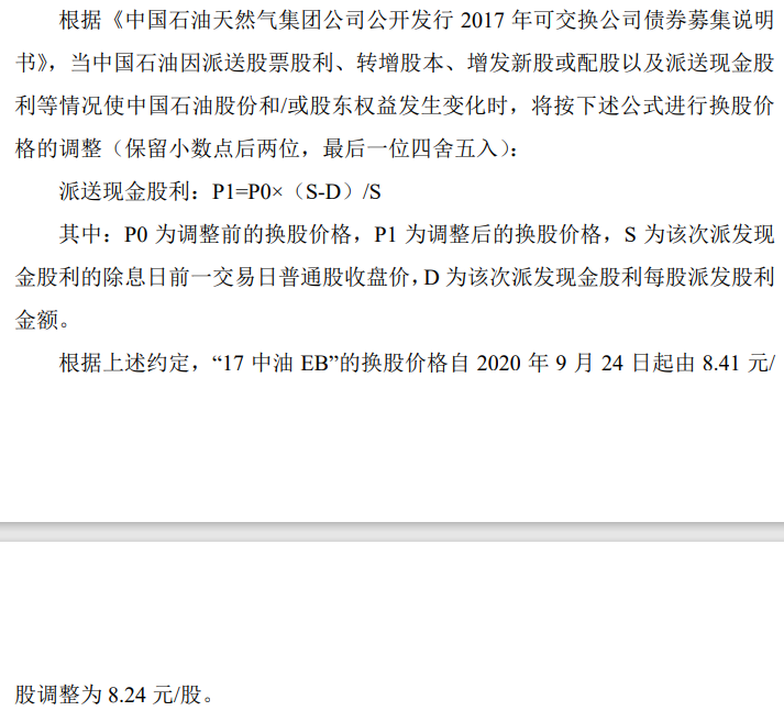 现存不少可交换债分红调整价格的方式是根据出息日前一日股票价格相关,下面看中油EB的转股价格调整公告: