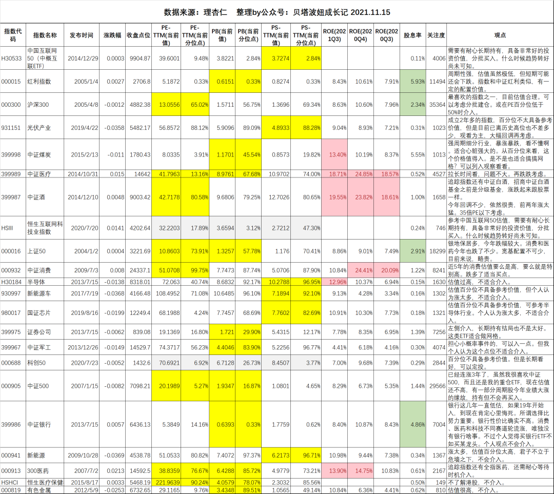 黄色背景代表的是该指数哪个指标更具备参考价值,灰色背景代表该指数成立时间较短,百分位不具备参考价值。红色背景的是ROE>15%的指数,绿色背景代表的是股息率高于2%的指数。