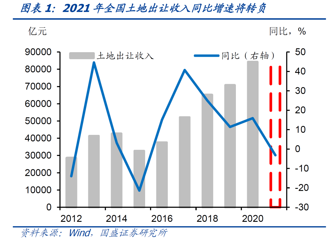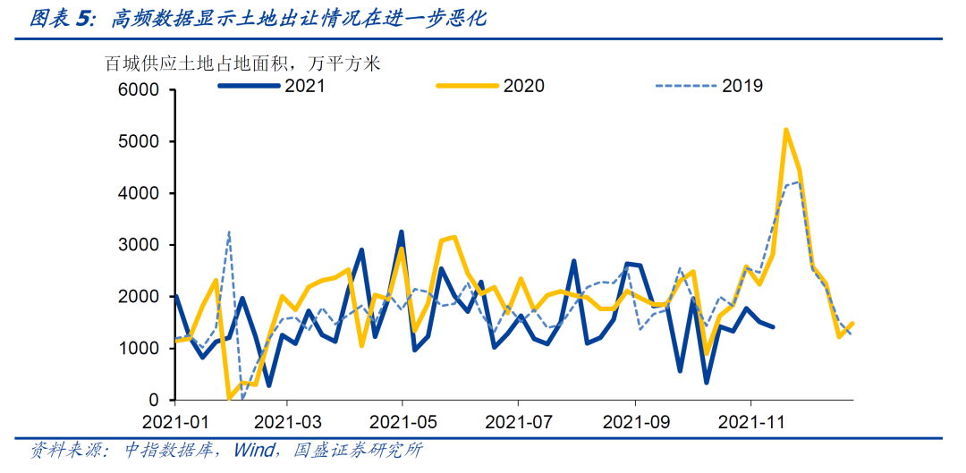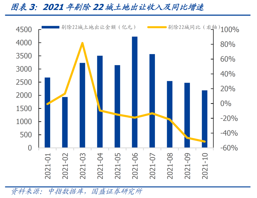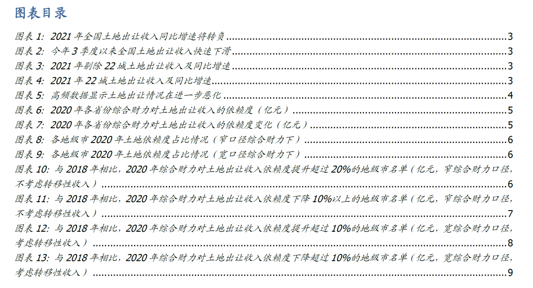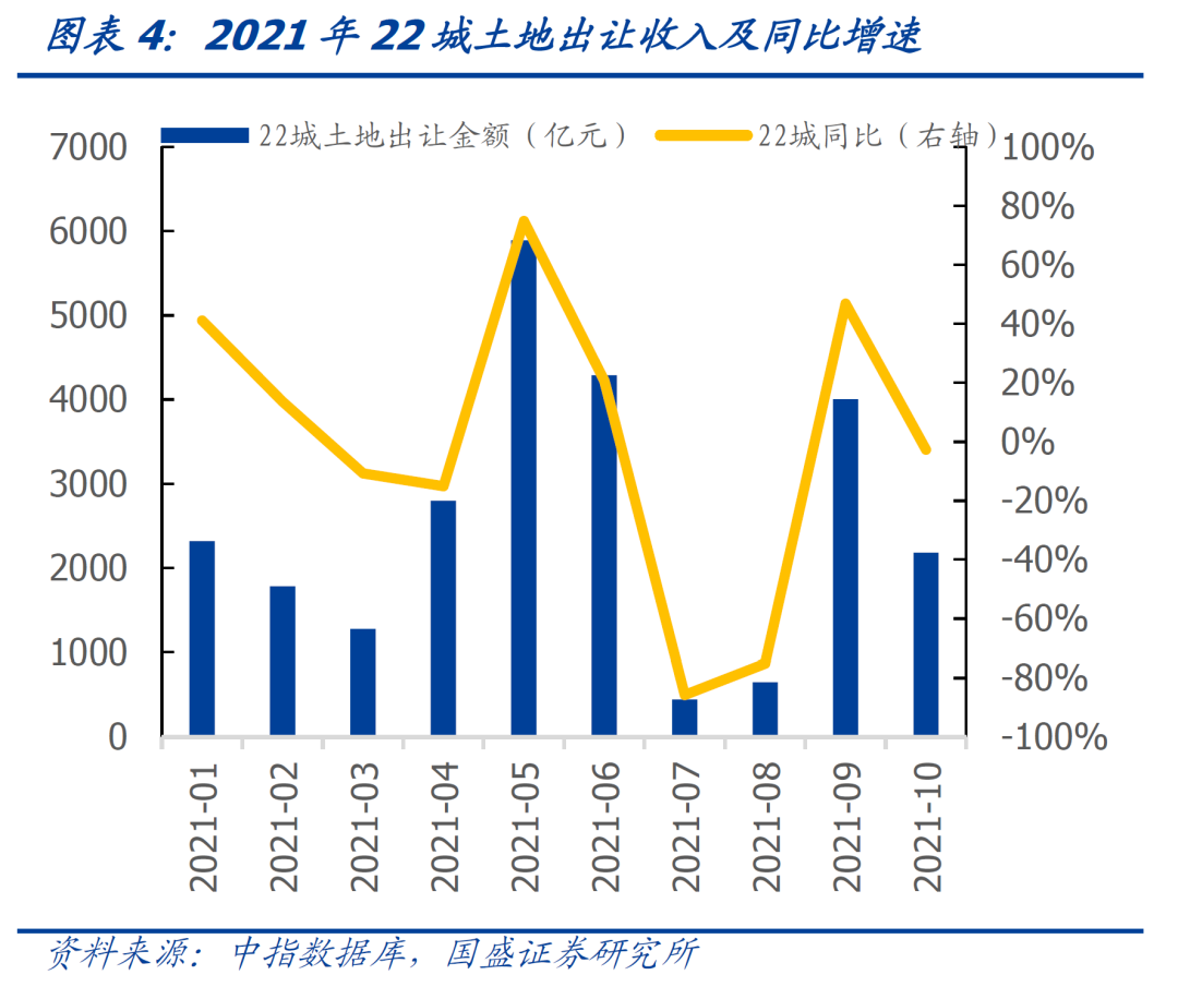 三季度土地出让收入明显下滑,四季度高频数据显示在进一步走弱,2021年全年土地出让收入预计将下降3.2%,2022年土地出让收入压力可能更大。随着宽松政策的逐步退出和对房地产政策的逐步收紧,2021年前9个月全国累计实现土地出让收入5.4万亿元,与去年同期增长8.7%,增速较2020年放缓。而分月度来看,年中以来土地出让收入增速转负,同比增速下滑至-10%以下,8月甚至接近20%。从高频数据显示,目前百城供应土地占地面积同比跌幅在一半左右。受限于房企资金紧张,传统的年末拿地旺季,今年成色或将非常不足,未来土地出让收入或将明显承压。如果假定未来几个月土地出让收入同比增速在-20%,那么全年土地出让收入将同比下降3.2%。而如果延续当前趋势,明年土地出让市场将面临更大压力。