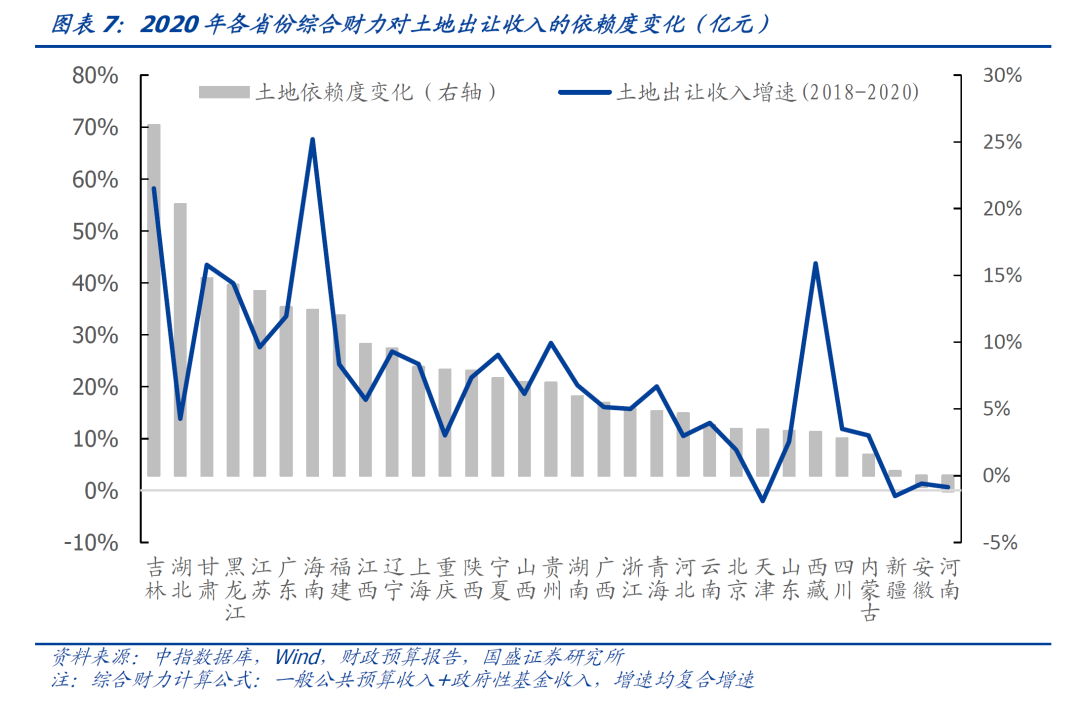 过去三年,全国大部分地区对土地出让收入依赖度有所提升,提升最为的是部分强省和债务偏重省份。2018-2020年全国大部分省市土地出让收入占综合财力比例有所提升,除了安徽(-0.83%)、河南(-1.18%)之外,过去三年其余所有省份综合财力更加依赖于土地出让收入,其中吉林、湖北土地出让收入在地方财力中占比提升20个百分点以上,甘肃、黑龙江、江苏等6省份提升幅度也在10%-20%之间。对土地财政更为依赖的省市分两类,一类是甘肃、吉林、黑龙江等经济偏弱而债务压力偏大省份,另一类是江苏、广东等房地产市场较为活跃的经济强省。