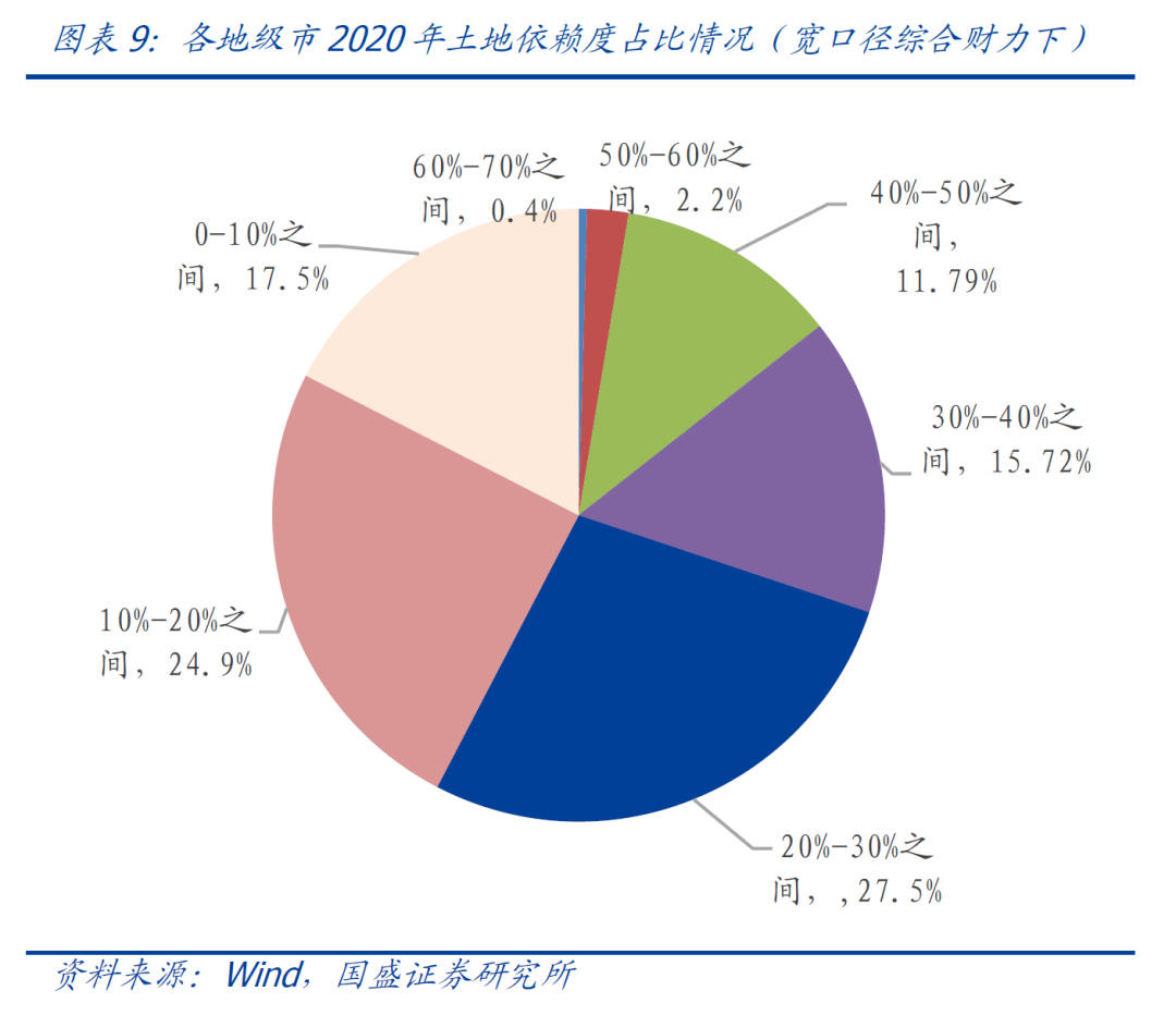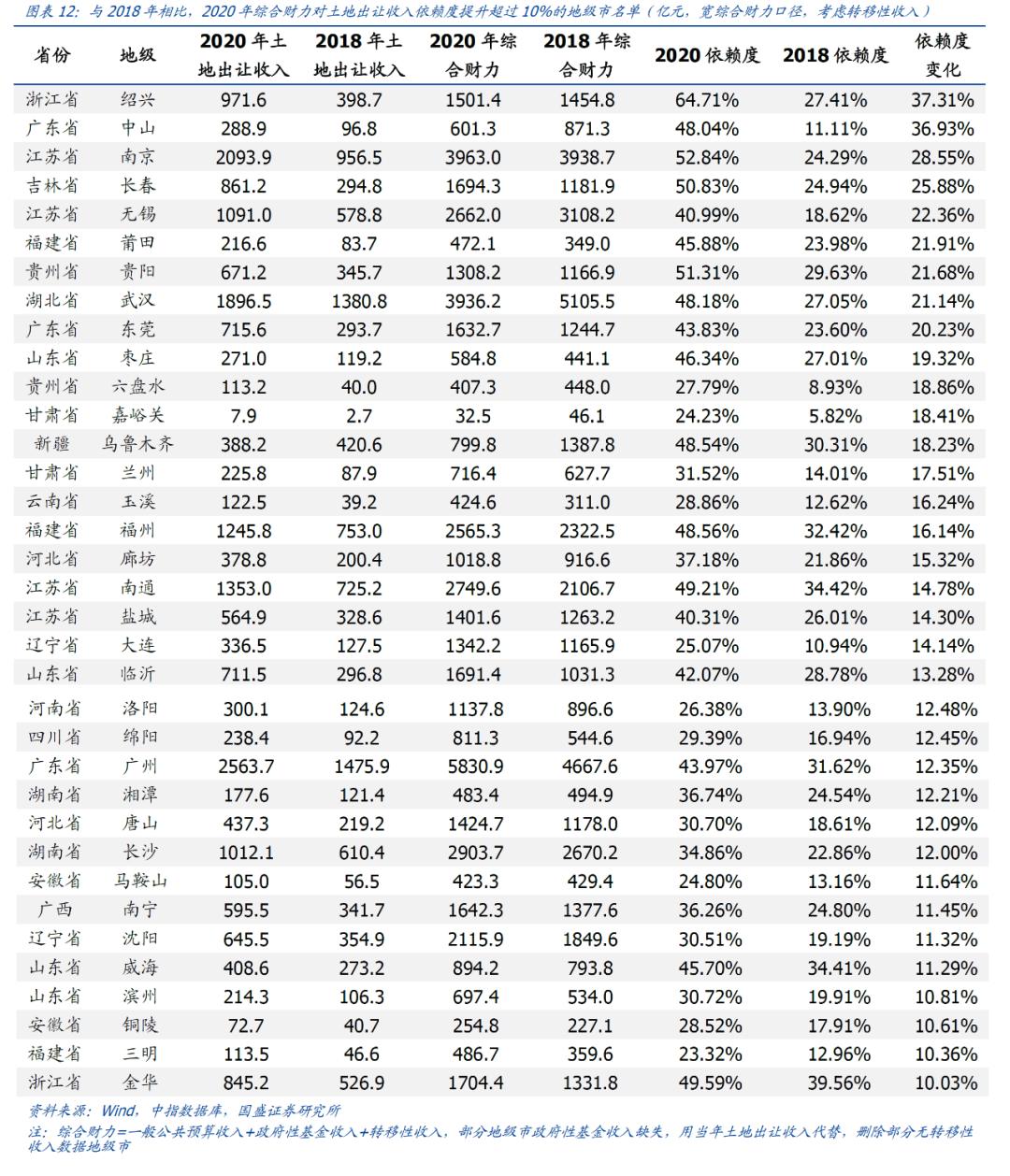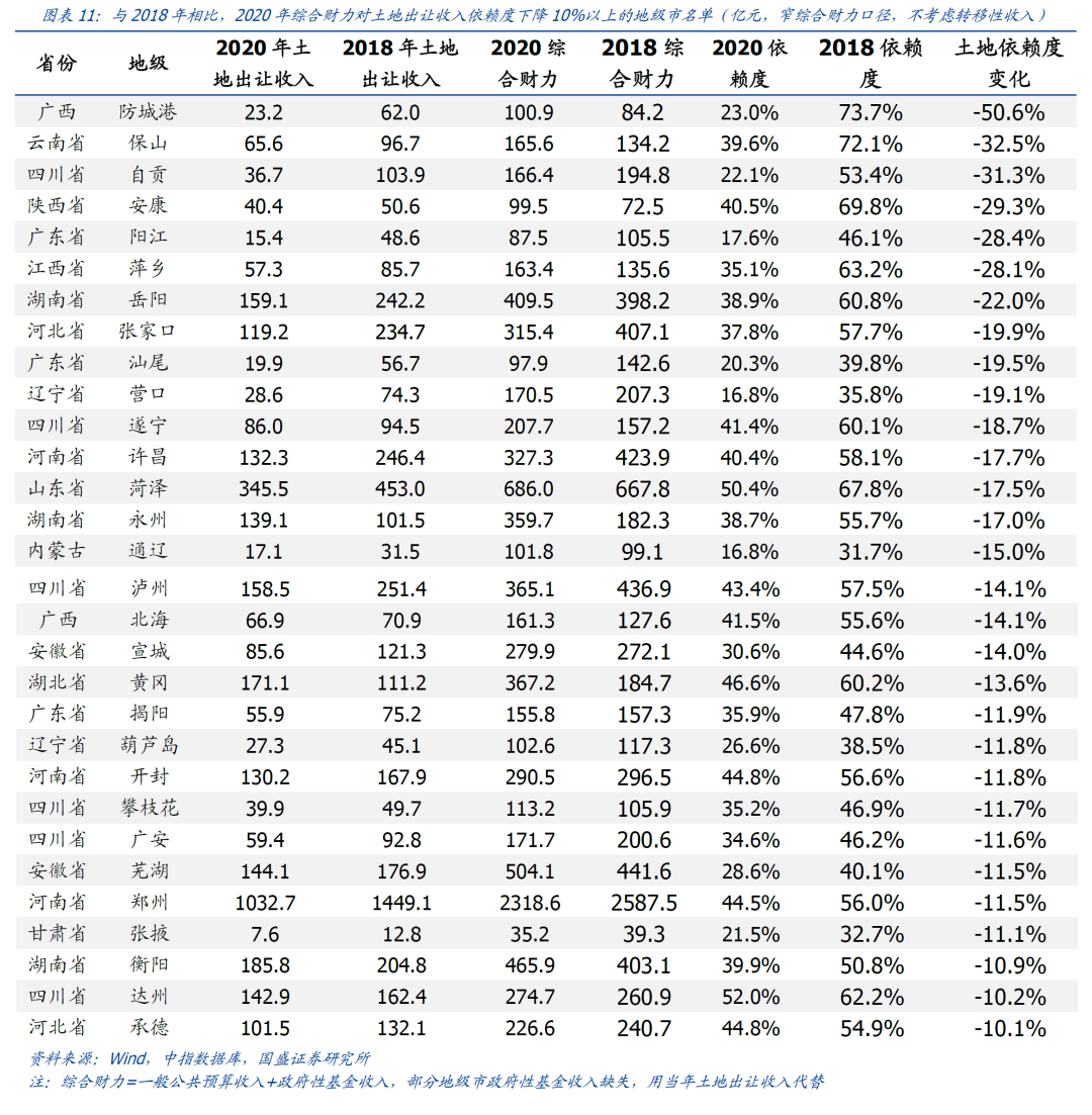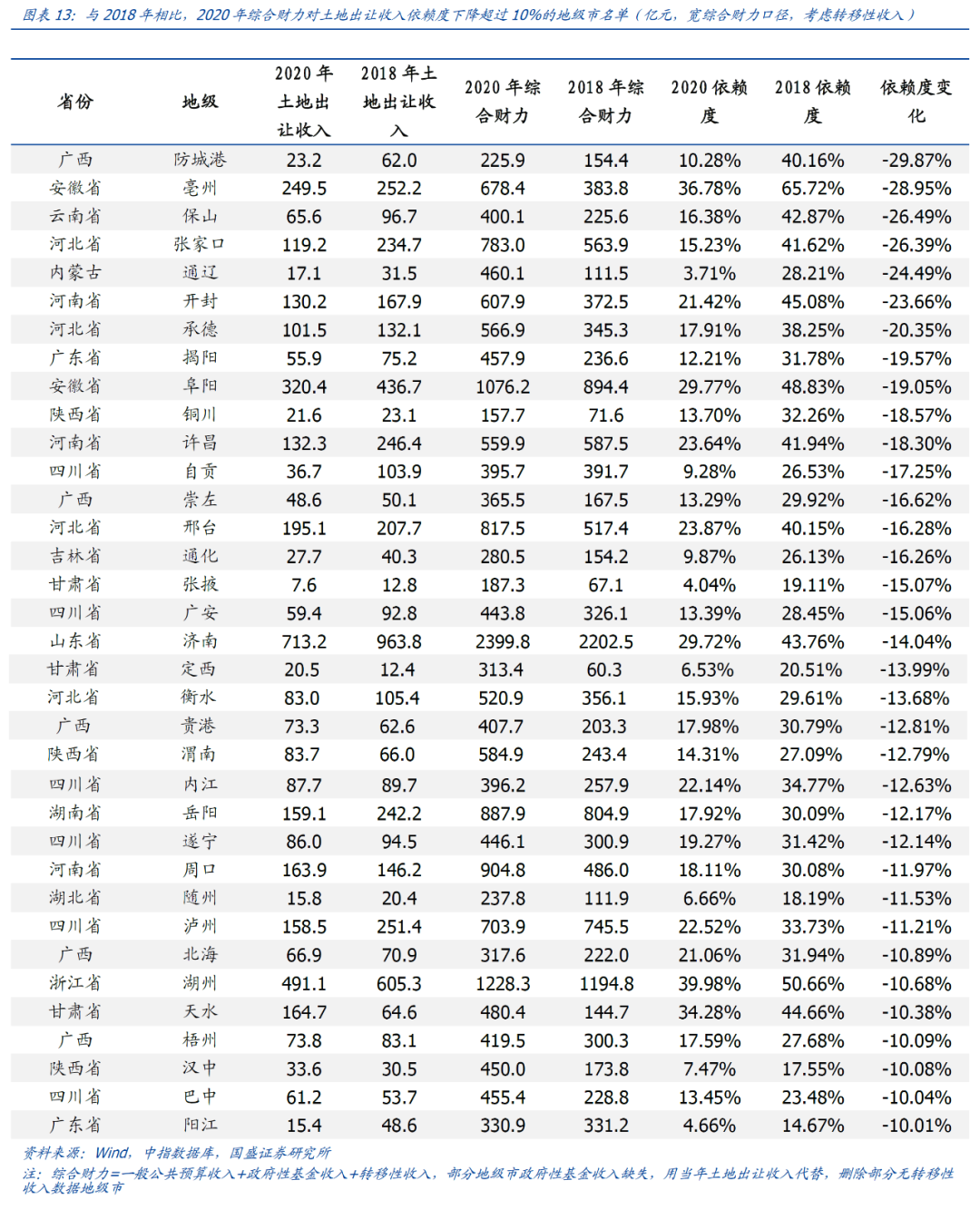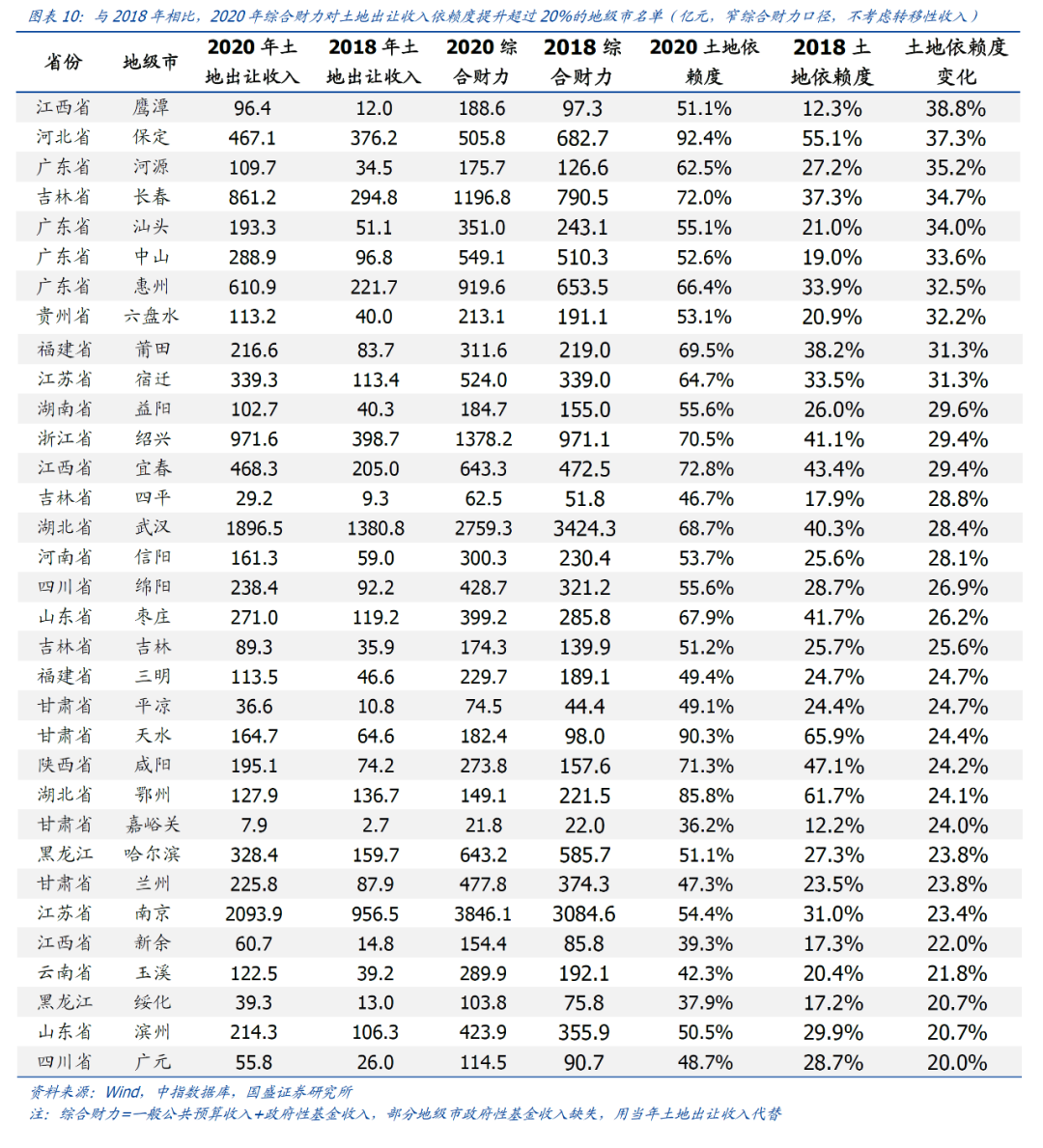 分地级市来看,我们在计算地方财力时分别考虑含转移支付和不含转移支付两个口径。在窄口径综合财力(不考虑转移性收入)下,2020年有28.4%地级市财力对土地出让收入的依赖度介于40%和50%之间,20.87%的地级市介于50%-60%之间,19.69%的地级市介于30%-40之间。与2018年相比有33个地级市对土地依赖度提升超过20个百分点,其中鹰潭市、保定市、河源市提升超35个百分点。有30个地级市对土地依赖度下降超过10%,其中防城港、宝山、自贡下降超过30个百分点。