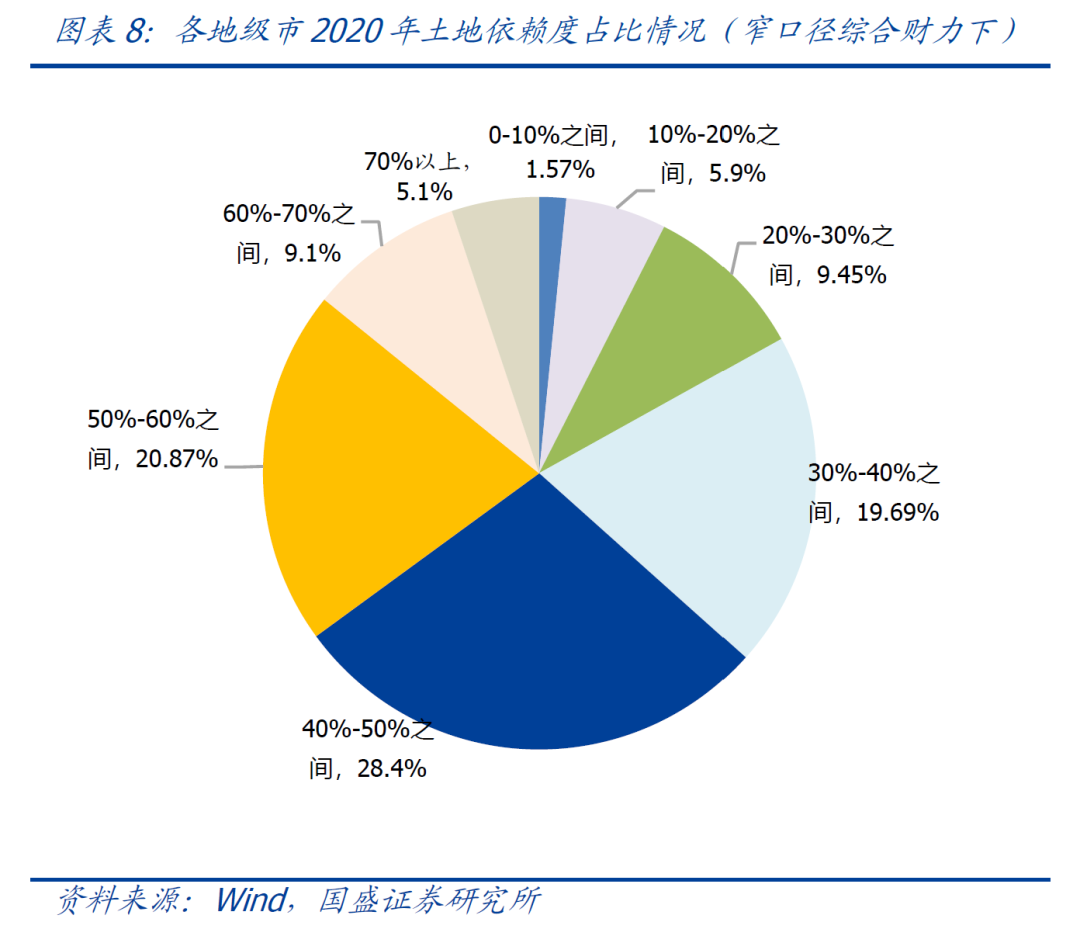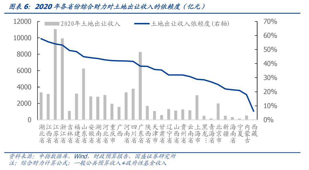 从省级分布来看,对土地出让收入较为依赖的更多是房地产市场较为活跃的经济强省。我国土地出让收入分布同样较为集中,江苏、浙江、广东、山东四个经济强省土地出让收入合计3.5万亿,占全国近四成。而从对土地出让收入依赖来看,这些房地产市场发达的地区也更为依赖。我们采用一般公共预算收入+政府性基金收入作为综合财力口径。采用2020年土地出让收入/综合财力衡量各个省份财力对土地出让收入的依赖程度。湖北(57.7%)、江西(55.5%)、江苏(54%)、浙江(53.2%)四省最高,均在50%以上。而对土地出让收入依赖较低的部分是土地资源稀缺,其它财力丰沛的地区,如北京、上海等一线城市,部分是经济欠发达,土地出让困难的地区,如黑龙江、内蒙等。土地出让收入占地方财力低于30%的九个省市就包括上海、北京、黑龙江、内蒙、新疆等。