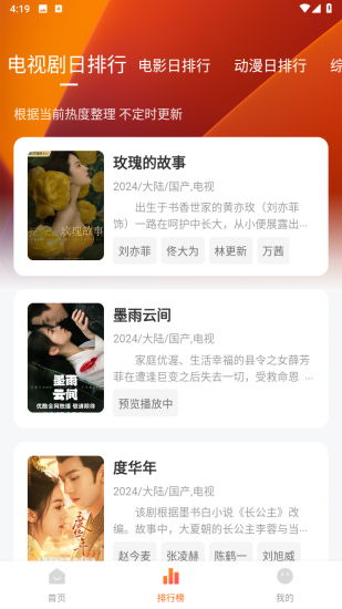 小柚子追剧app安卓版是一款非常不错的手机追剧软件,软件上的影视资源非常多,多到什么程度呢?就这么来说吧,你所能够想到的影视资源这里基本都有,而且还会同步更新最新的影视资源,确保影视资源的充足,让你从此远离剧荒。软件除了有着资源丰富、更新及时这两个优点之外,还有着类型齐全、功能强大、免费追剧、高清画质、播放流畅等优点,尤其是免费追剧这个优点,可以让你省下很多充值会员的钱。另外,软件内置了排行榜区域,在排行榜区域中你可以看到各大榜单,每个榜单上都有大量的影视资源,而这些能够上榜的影视资源都是经过广大用户的筛选,在影视质量上通常是没有问题的,都是比较推荐观看的。