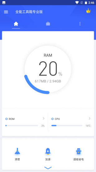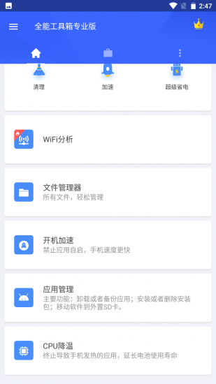 全能工具箱官方正版是一款超级实用且专为安卓手机所设计的安卓工具箱软件,软件里面有着一大堆优化功能和实用工具等着你来使用,比如清理、加速、超级省电、文件管理器、开机加速、应用管理等等,让你可以全面优化手机性能,提升运行速度,解决手机反应慢、手机存储不足、频繁卡顿以及耗电快等问题。软件还可以直接查看手机系统信息,让你清清楚楚地知道自己的手机系统信息是什么,而这样一来当你需要刷机或者是更换手机屏幕的时候就不用担心手机零件被换的情况发生了,毕竟一看便知。对工具箱软件有需求的朋友快来本站下载使用吧!