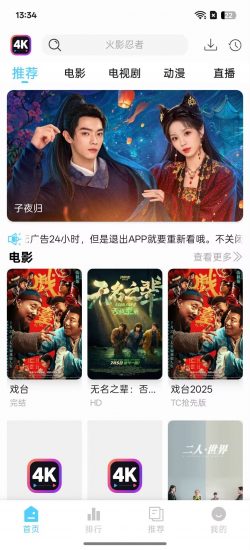 2、画质调节:根据网络环境自由切换4K/1080P/流畅模式,节省流量不卡顿。
