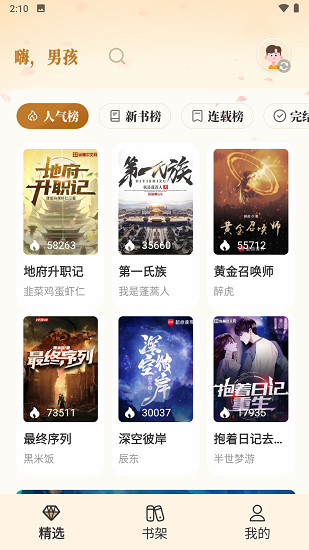 2、强大搜索:通过书名、作者等快速查找小说,也可按人气榜、新书榜等榜单查找热门作品.