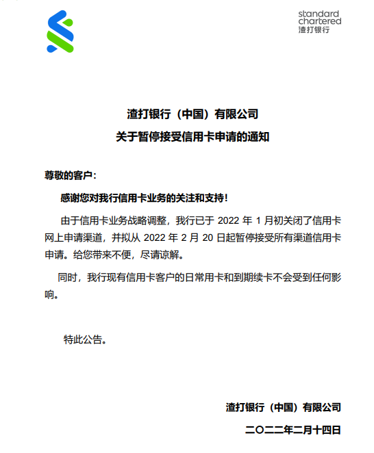 2月14日,渣打银行(中国)有限公司发布公告称,由于信用卡业务战略调整,该行已于2022年1月初关闭了信用卡网上申请渠道,并拟从2022年2月20日起暂停接受所有渠道信用卡申请。